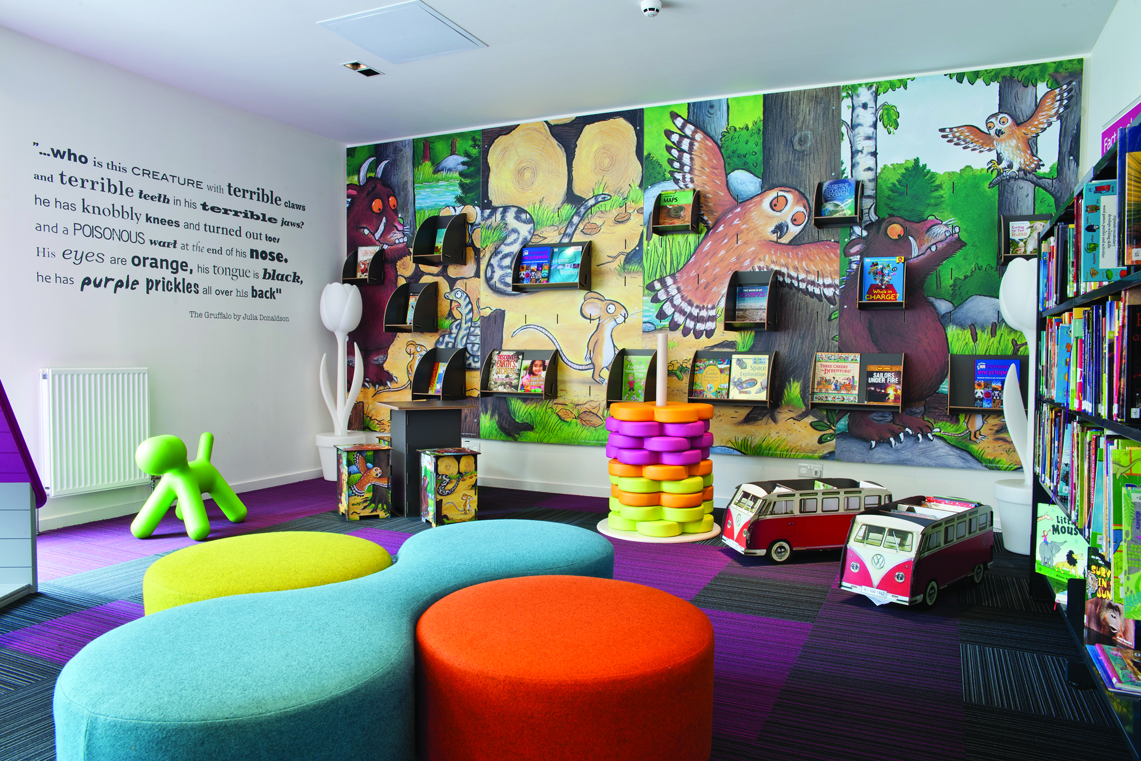Die Hauptthemen und Bereiche der Bibliothek werden durch Grafiken und Schilder aufgewertet, die mit Genehmigung der Hofdichterin der Kinder, Julia Donaldson, verwendet werden. Dabei setzten wir ihre beliebten Gruffalo-Darstellungen als Wandgrafiken in der Kinderabteilung ein und führten dieses Thema bis hin zu den maßgeschneiderten Minimöbeln weiter.