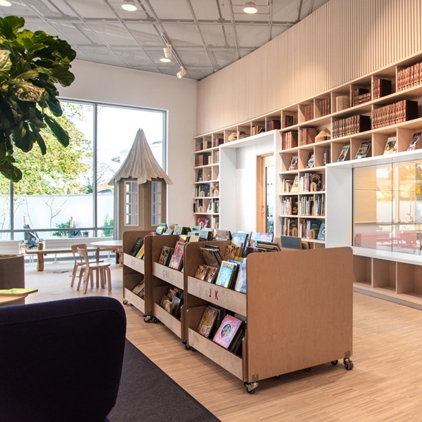 Beliebter Bilderbuchtrog mit drei Präsentationsfächern jeweils mit zwei verstellbaren Trennwänden und Aufbewahrungsschubladen mit zwei Fächern auf Rollen im unteren Bereich auf beiden Seiten.