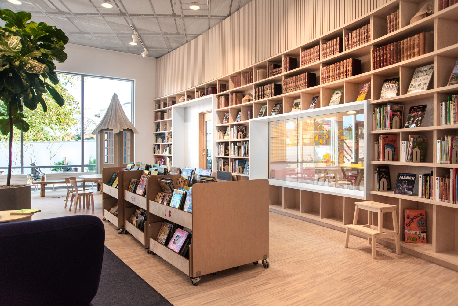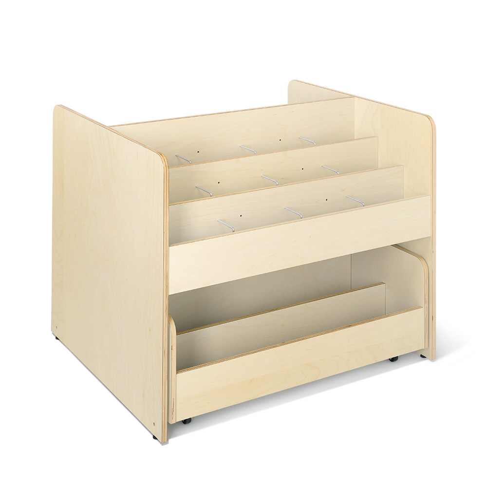 Beliebter Bilderbuchtrog mit drei Präsentationsfächern jeweils mit zwei verstellbaren Trennwänden und Aufbewahrungsschubladen mit zwei Fächern auf Rollen im unteren Bereich auf beiden Seiten.