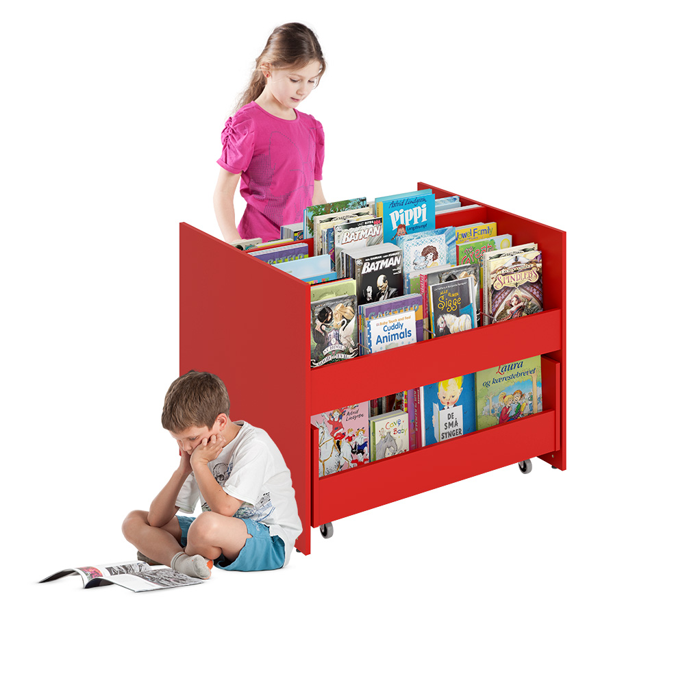 Beliebter Bilderbuchtrog mit drei Präsentationsfächern jeweils mit zwei verstellbaren Trennwänden und Aufbewahrungsschubladen mit zwei Fächern auf Rollen im unteren Bereich auf beiden Seiten.