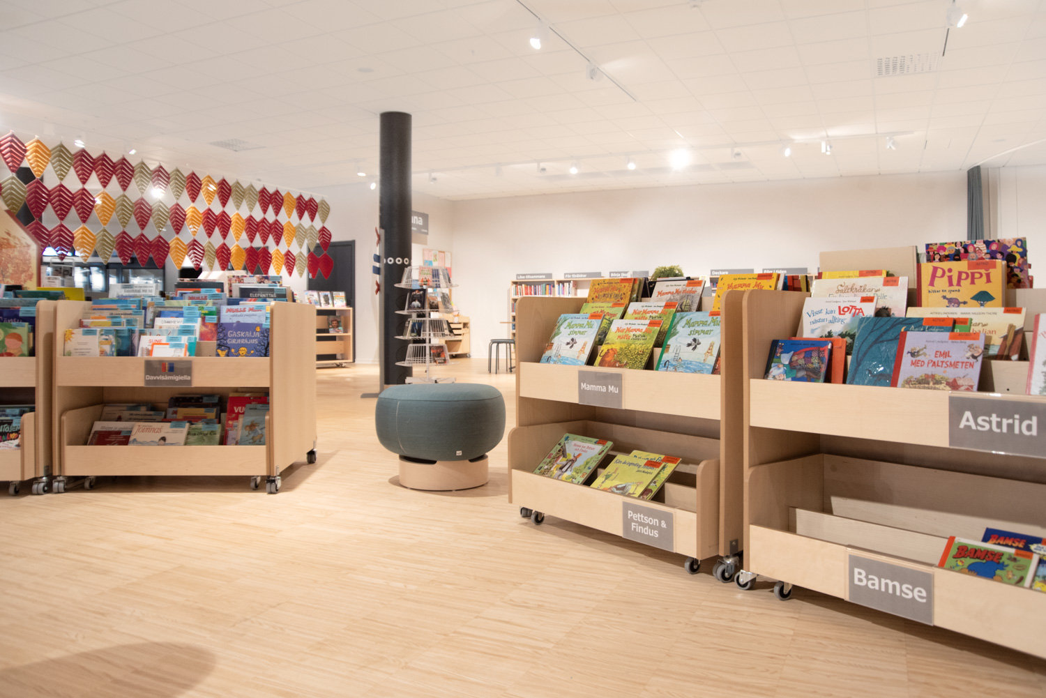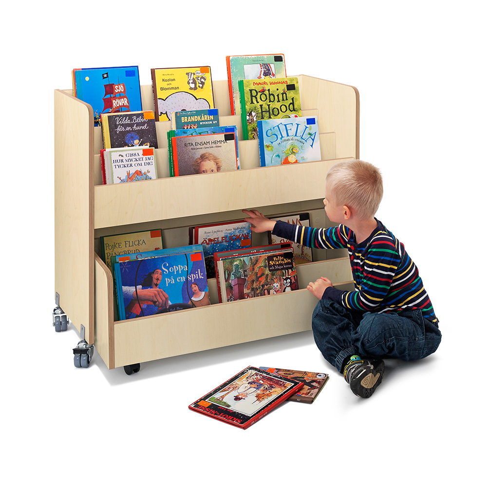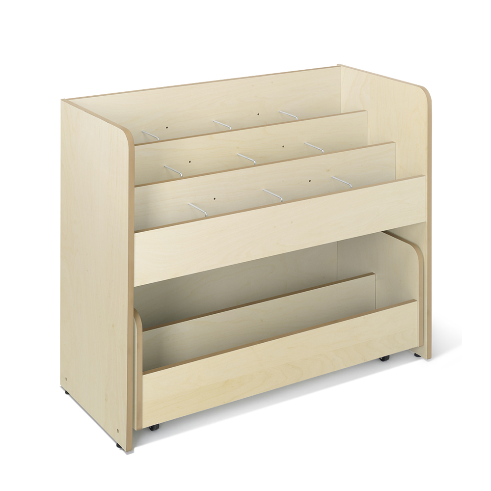 Beliebter Bilderbuchtrog mit drei Präsentationsfächern jeweils mit zwei verstellbaren Trennwänden und Aufbewahrungsschubladen mit zwei Fächern auf Rollen im unteren Bereich.