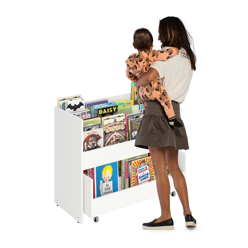 Beliebter Bilderbuchtrog mit drei Präsentationsfächern jeweils mit zwei verstellbaren Trennwänden und Aufbewahrungsschubladen mit zwei Fächern auf Rollen im unteren Bereich.