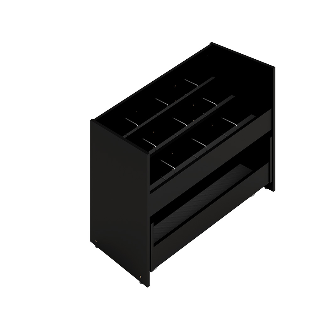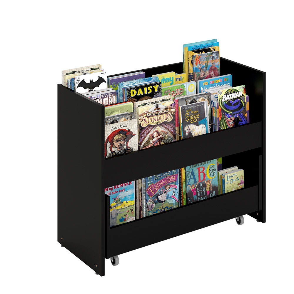 Beliebter Bilderbuchtrog mit drei Präsentationsfächern jeweils mit zwei verstellbaren Trennwänden und Aufbewahrungsschubladen mit zwei Fächern auf Rollen im unteren Bereich.