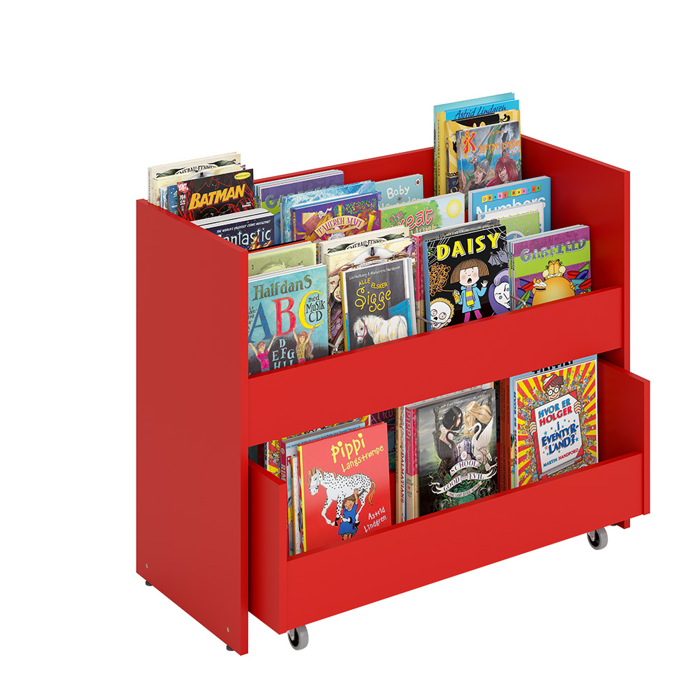Beliebter Bilderbuchtrog mit drei Präsentationsfächern jeweils mit zwei verstellbaren Trennwänden und Aufbewahrungsschubladen mit zwei Fächern auf Rollen im unteren Bereich.