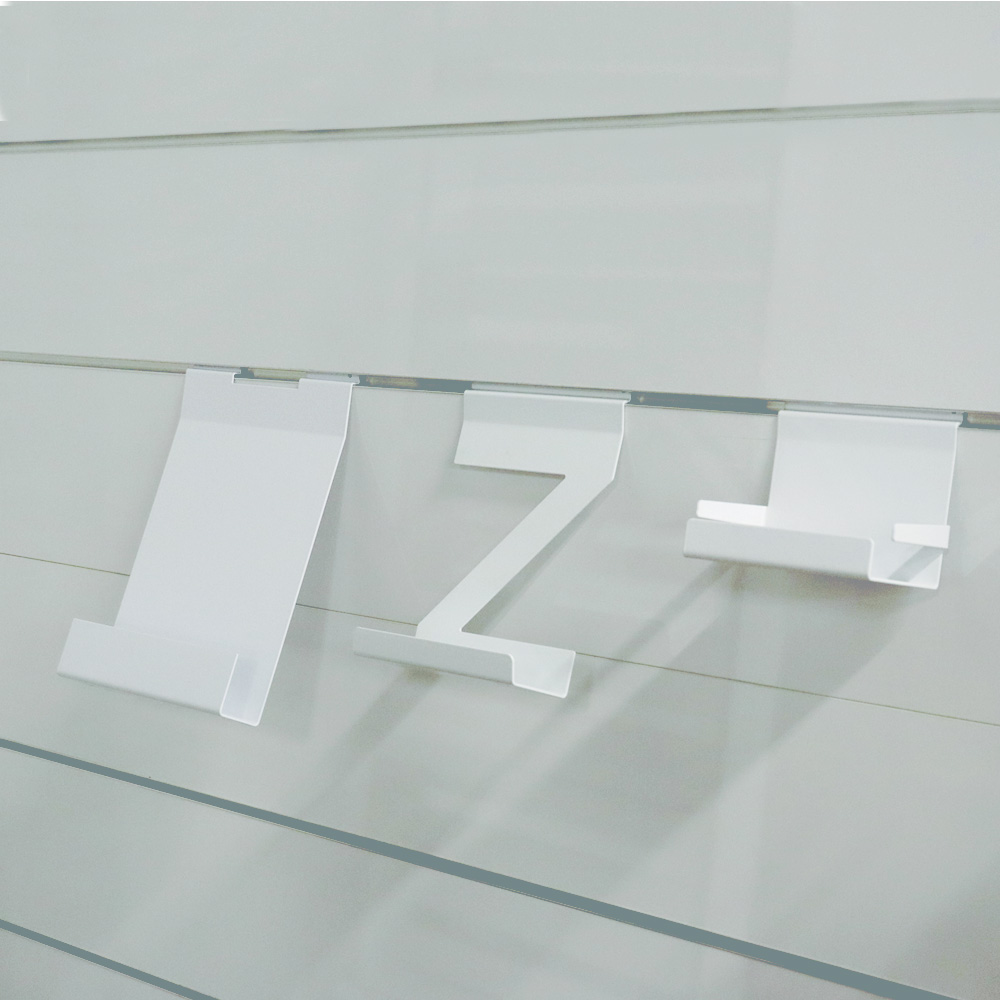 Eine Kollektion von Metallhalteren passend für Lamellenwände sowie für unseren Quattro Präsentationsturm.