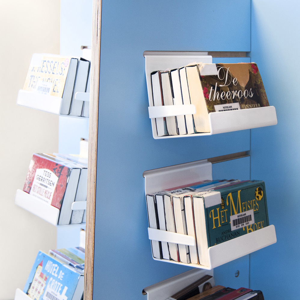 Die Halter lassen sich leicht bewegen, um flexible Ausstellungslösungen für Bücher, AV-Media wie CD/DVDs, Magazinen, Brochuren, usw. zu erstellen.