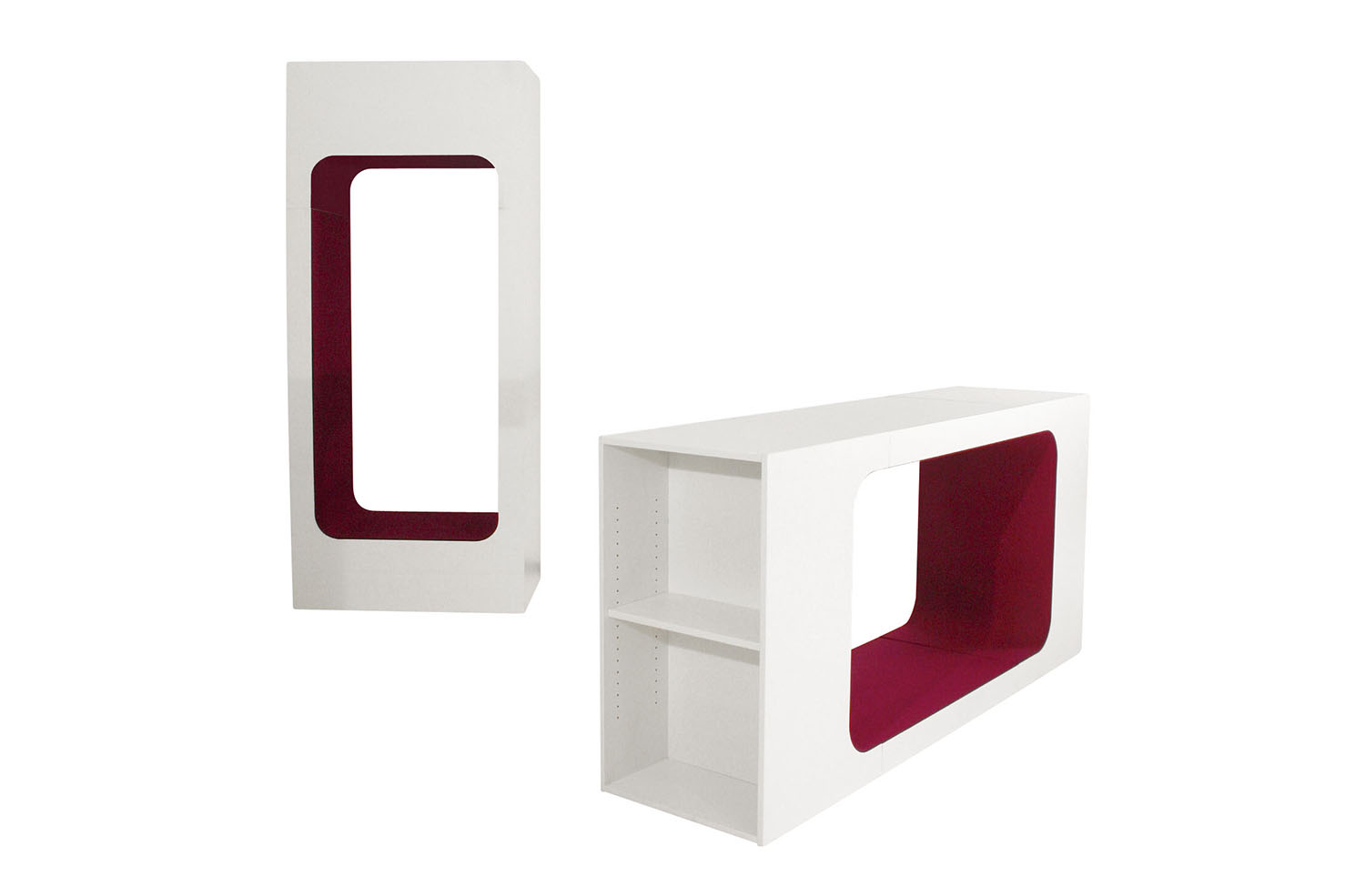 Vertikal fungiert Cocoon als Sitzmöbel und ist in zwei unterschiedlichen Gesamthöhen und zwei Sitzhöhen erhältlich. Als solches kann es auch in das Regalsystem integriert werden oder eben ein freistehendes Möbel sein.