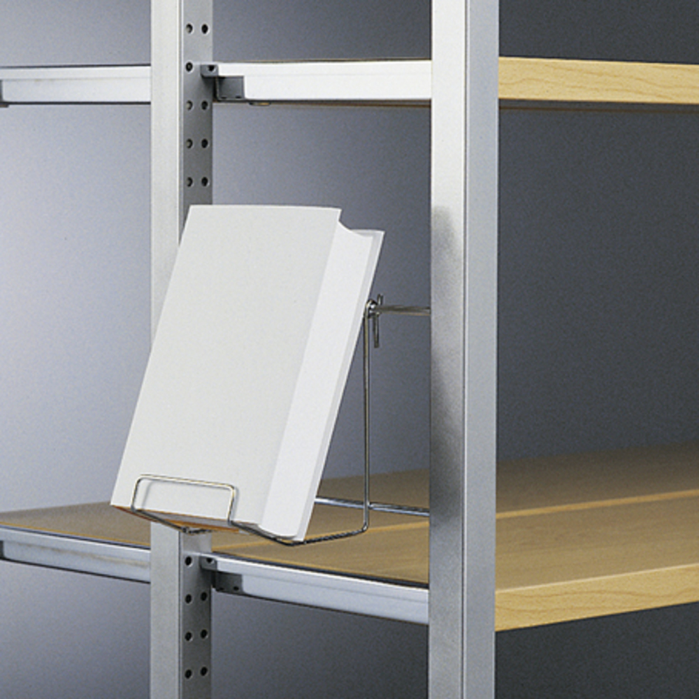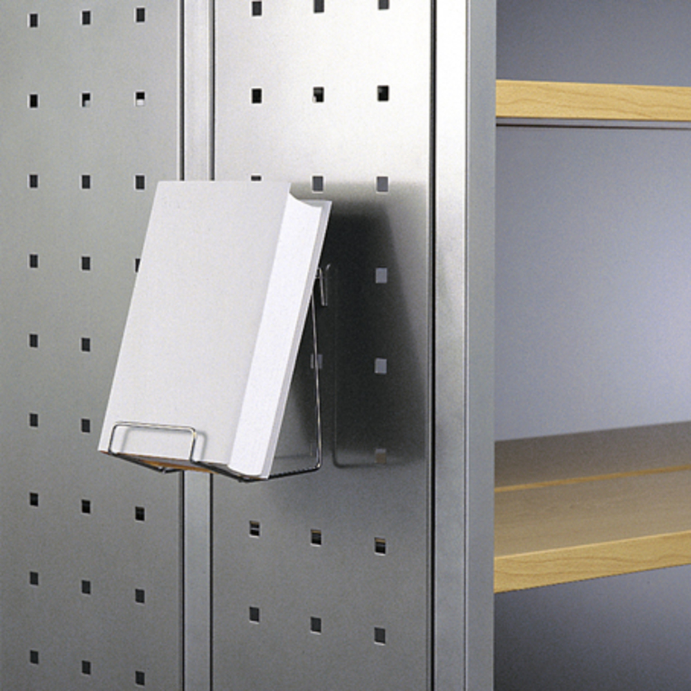 Zum Einhängen in Präsentationsgitter, Lochblechseitenverkleidungen mit Rundlochung RG 5/25, Quadratlochung QG 10/62,5 und Schlitzlochung 4/40, sowie mit zwei Auflagestäben Modell B 1 auch zum direkten Einhängen in Regalstirnseiten.