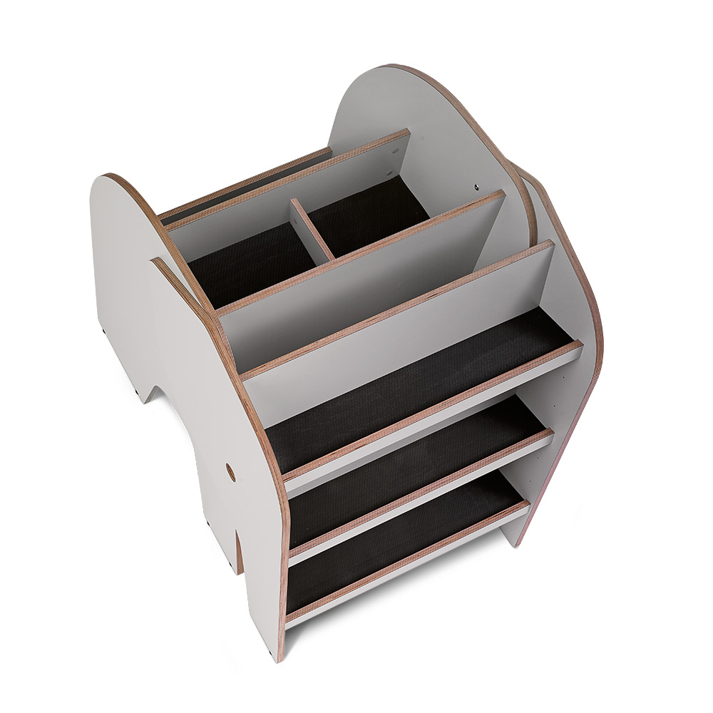 Hier geht es um laminiertes Birkensperrholz, auf dem Foto mit sichtbaren Kanten. Damit lassen sich eine strapazierfähige Oberfläche und eine langlebige Konstruktion erzielen. Ideal für die meisten stark beanspruchten Bibliotheksumgebungen!