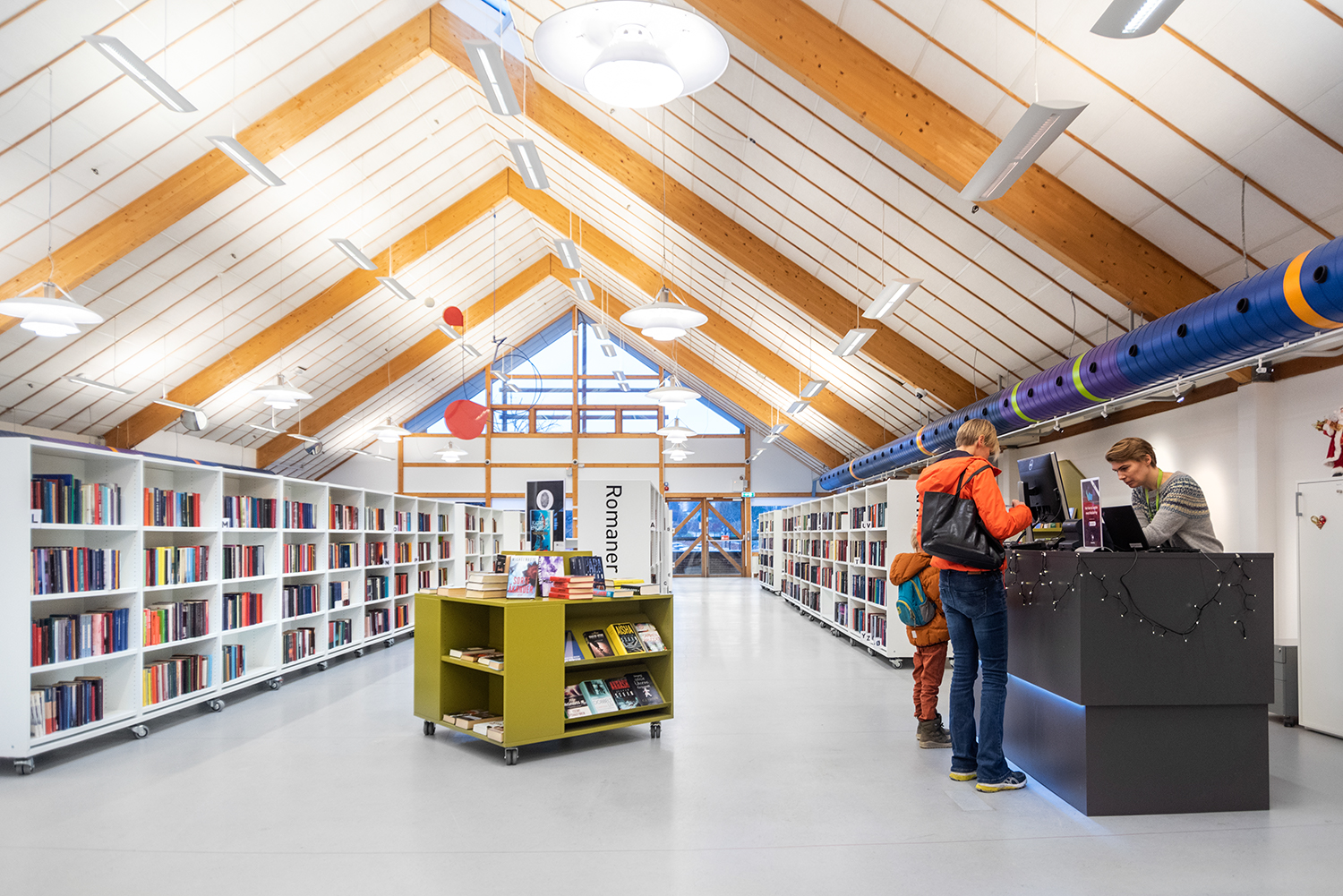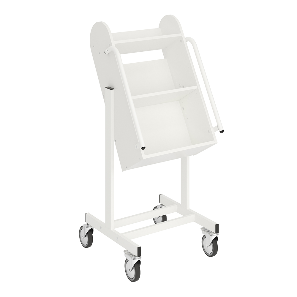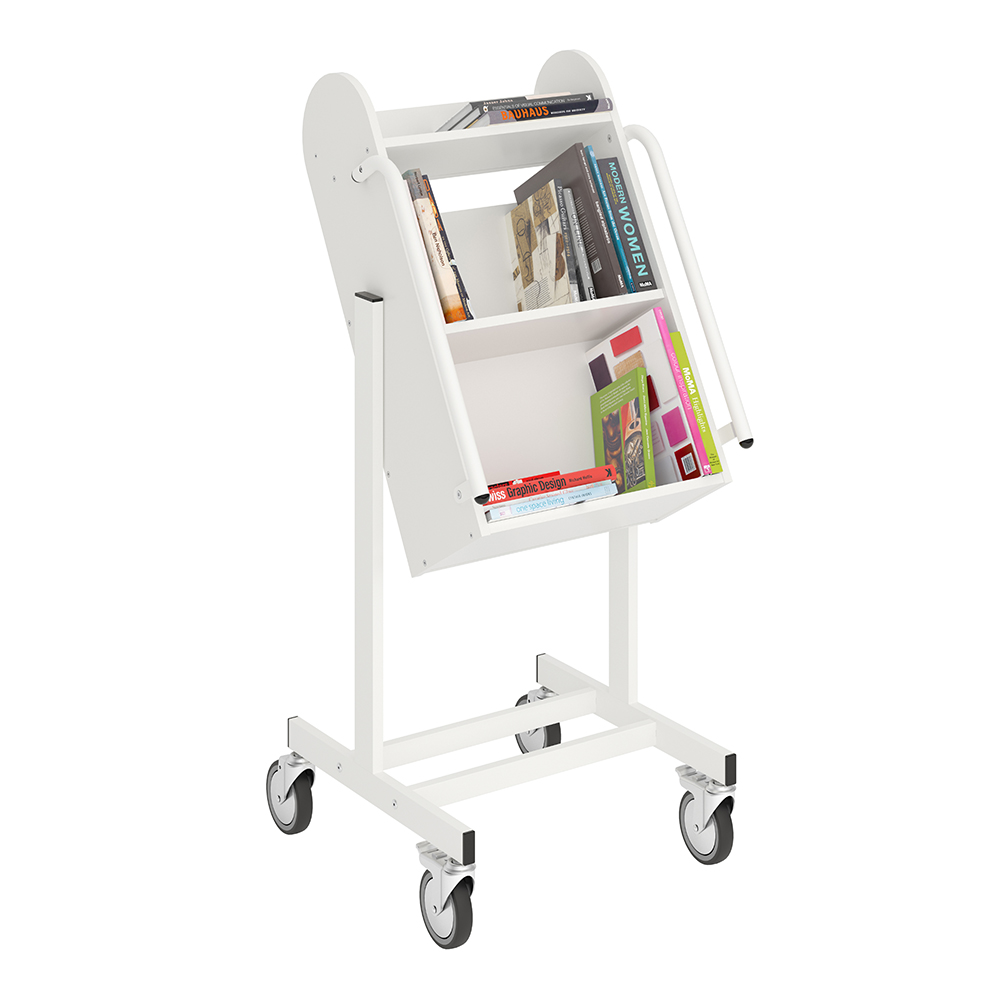Die Neigung des Bücherwagens sorgt für eine sichere Medienunterbringung und bietet eine gute Übersicht über die jeweiligen Bücher.