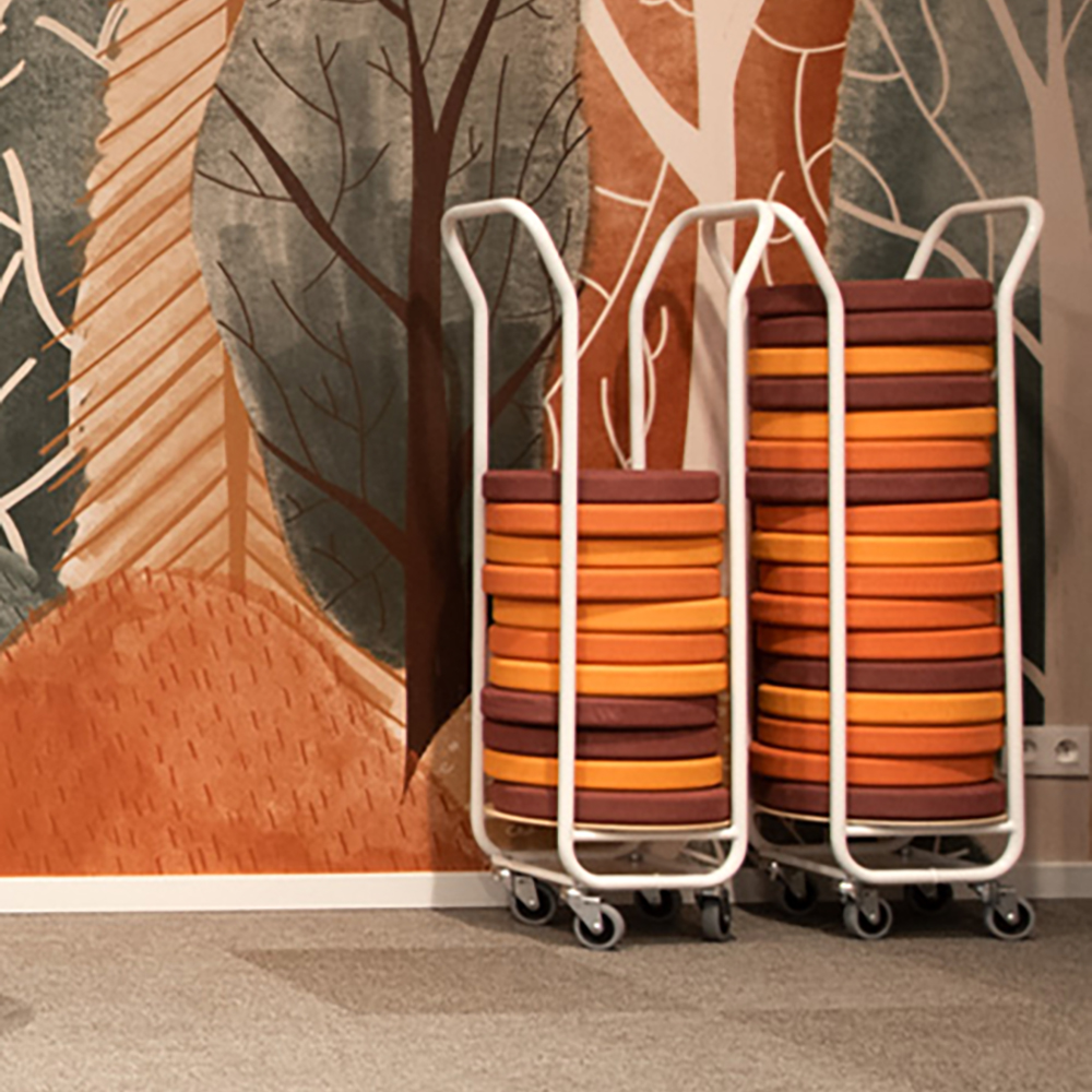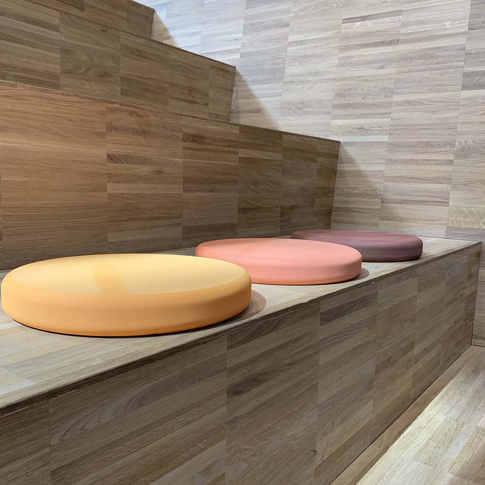 Das Kissen ist erhältlich in zwei Designs und verschiedenen Farben. Ideal zur Nutzung auf dem Boden, auf Bänken und Podien.