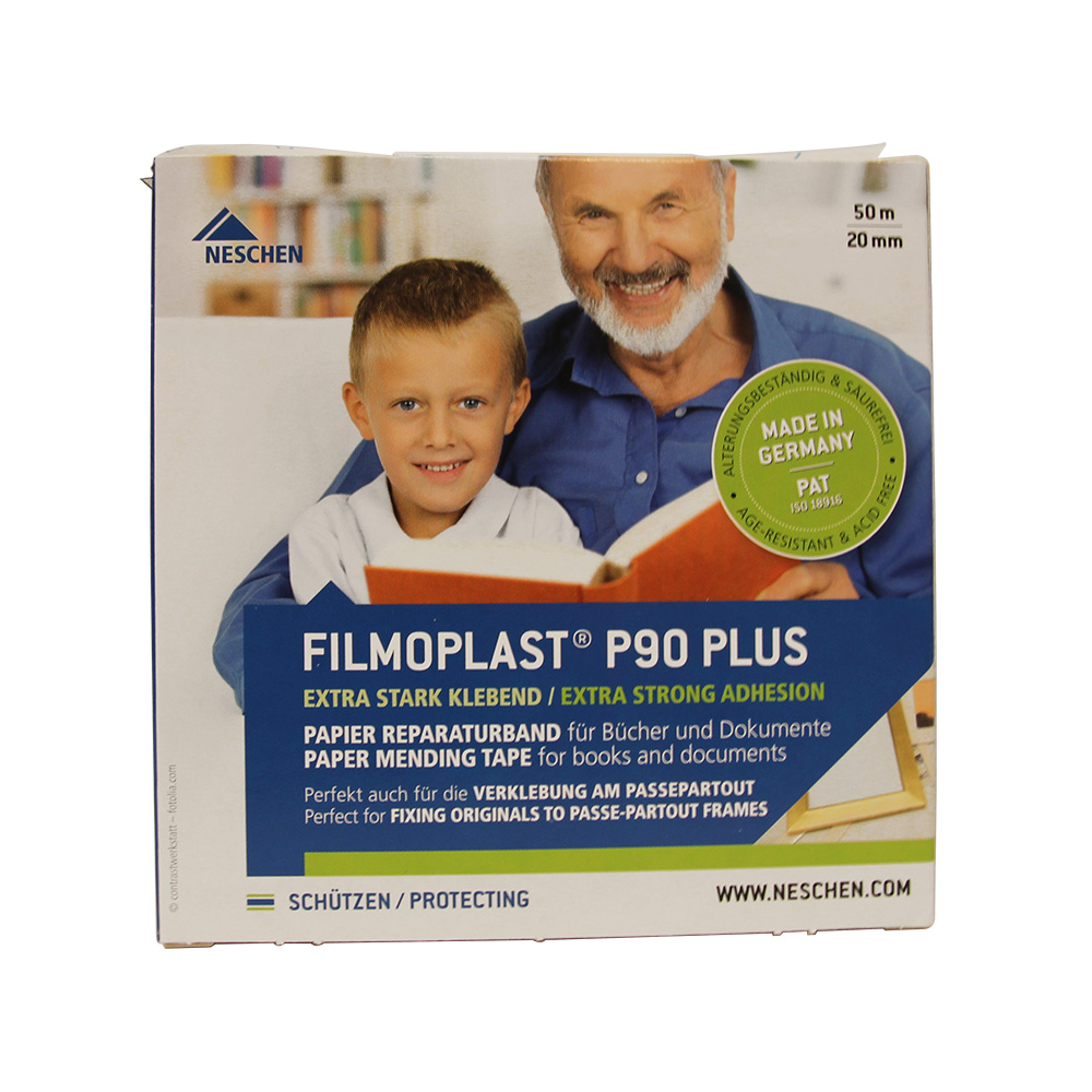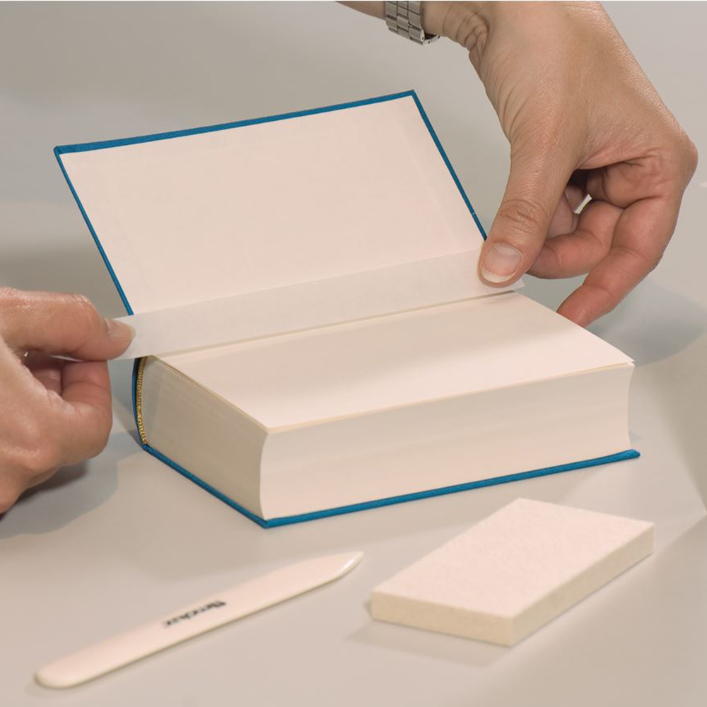 Das Papier verhindert Druckstellen am Original und ist beschichtet mit einem alterungsbeständigen, nicht vergilbenden, nicht durchschlagenden, dauerhaft elastischen Acrylatkleber.