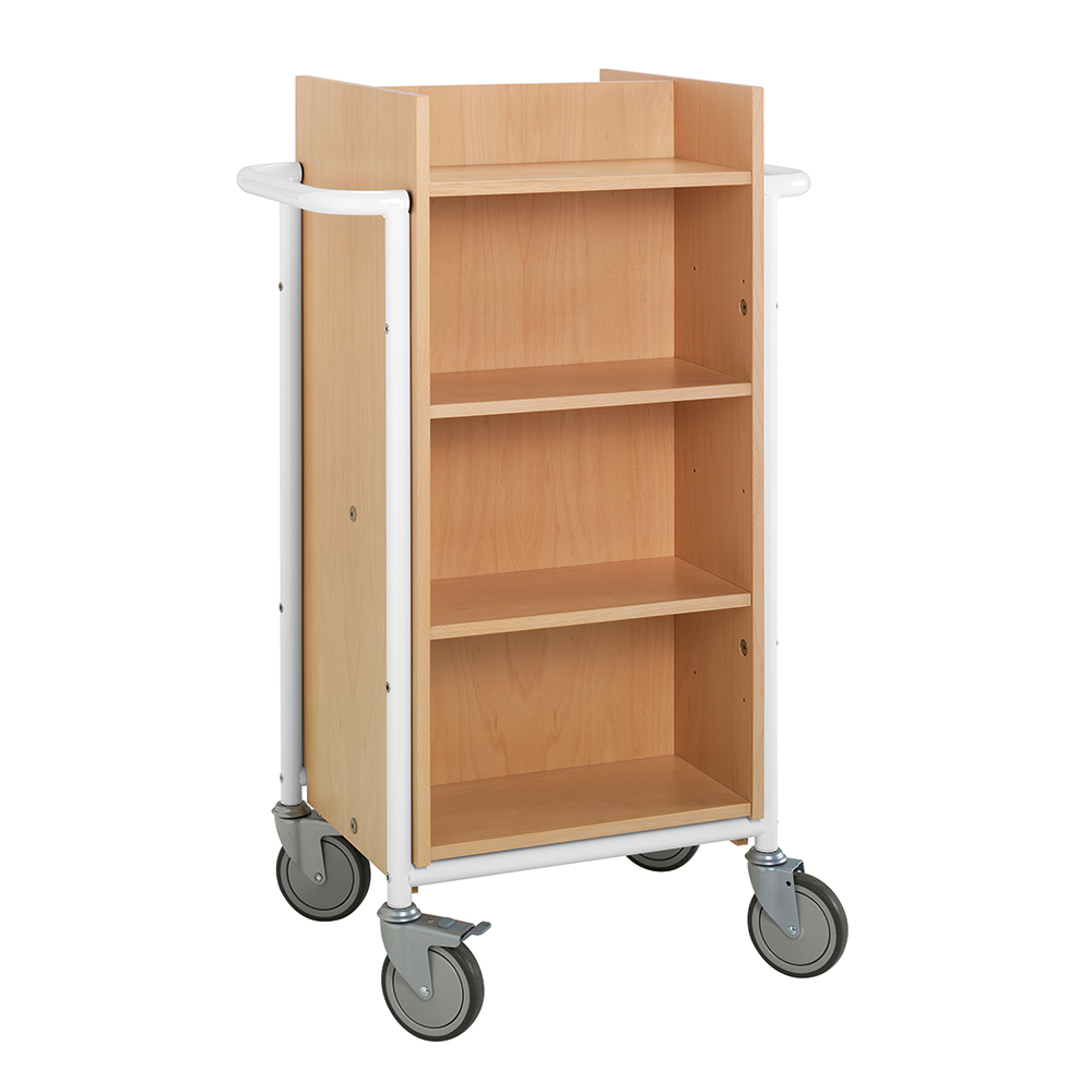 Funktioneller, doppelseitiger Wagen mit acht Fachböden. Sechs Fachböden sind versetzbar und können an der Größe der Medien angepasst werden.