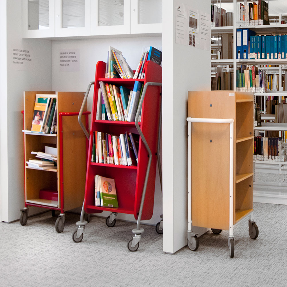Diesen Bücherwagen kann man als fahrbares Miniregalsystem einsetzen - überall in der Bibliothek, wo es gerade gebraucht wird.