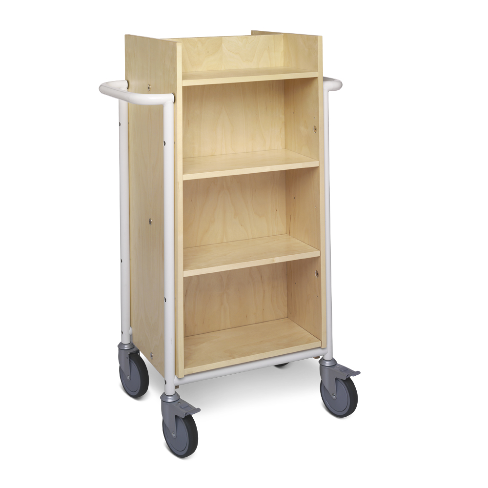 Funktioneller, doppelseitiger Wagen mit acht Fachböden. Sechs Fachböden sind versetzbar und können an der Größe der Medien angepasst werden.