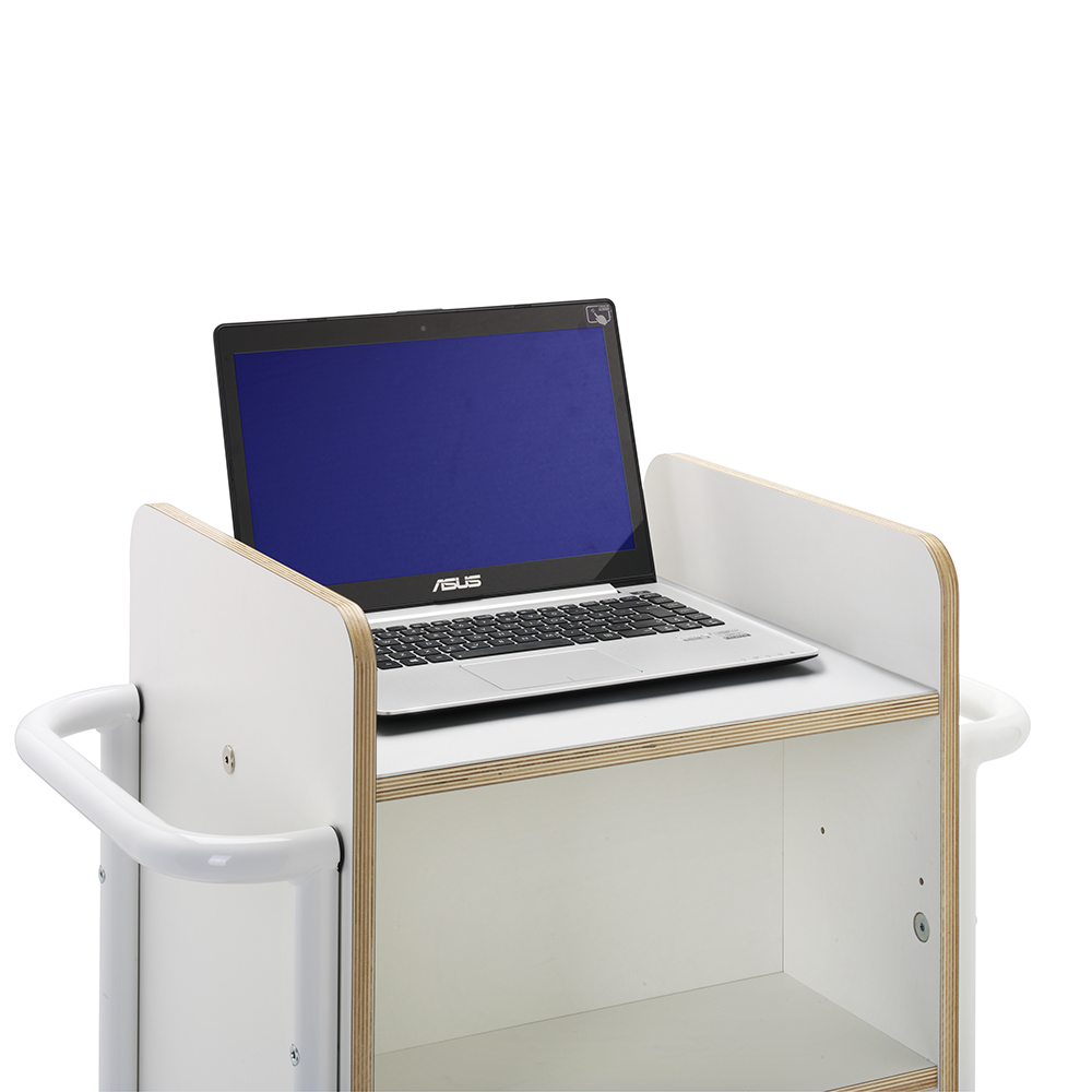 Funktioneller, doppelseitiger Wagen mit sechs Fachböden und Ablagefläche oben für das Laptop. Vier Fachböden sind versetzbar und können an der Größe der Medien angepasst werden.