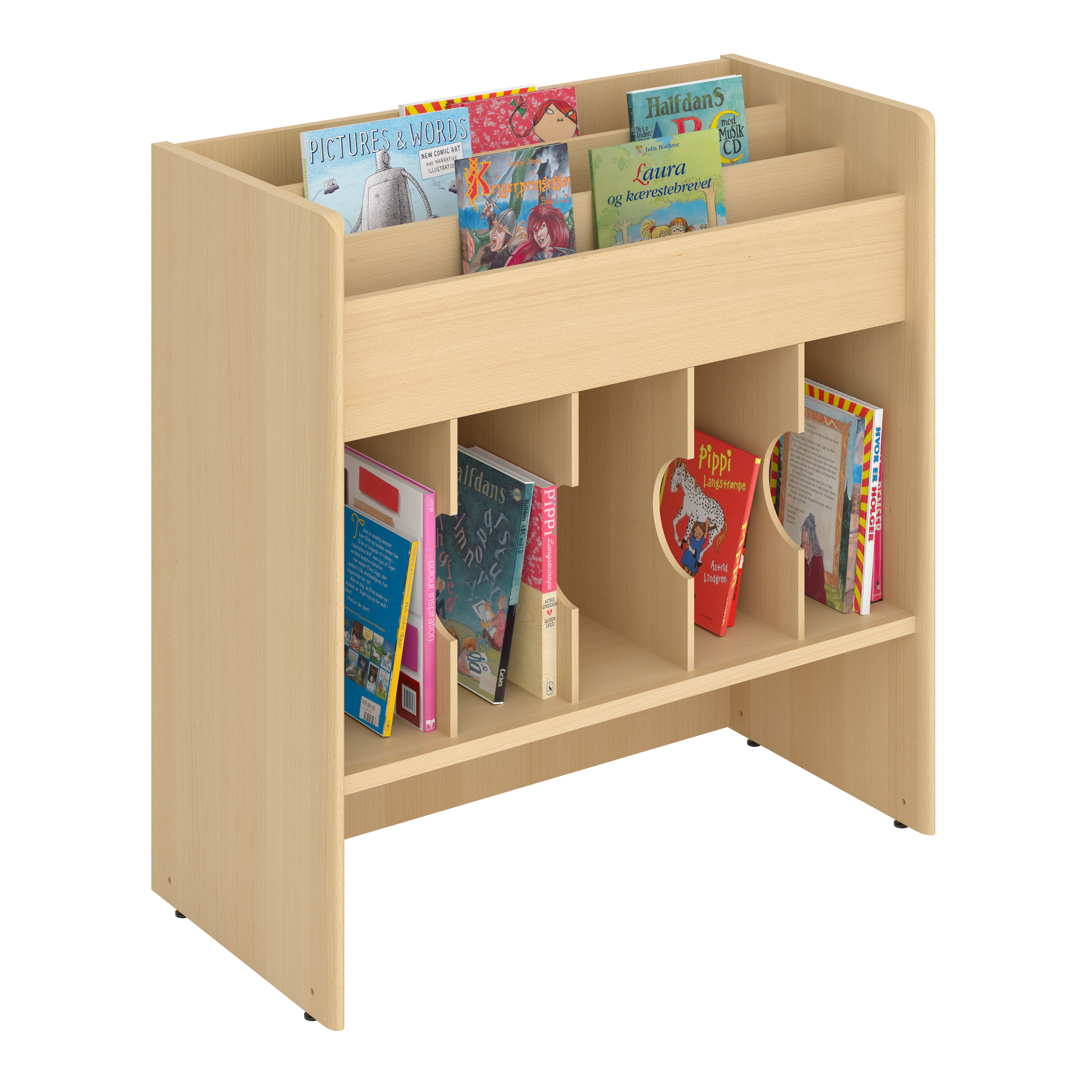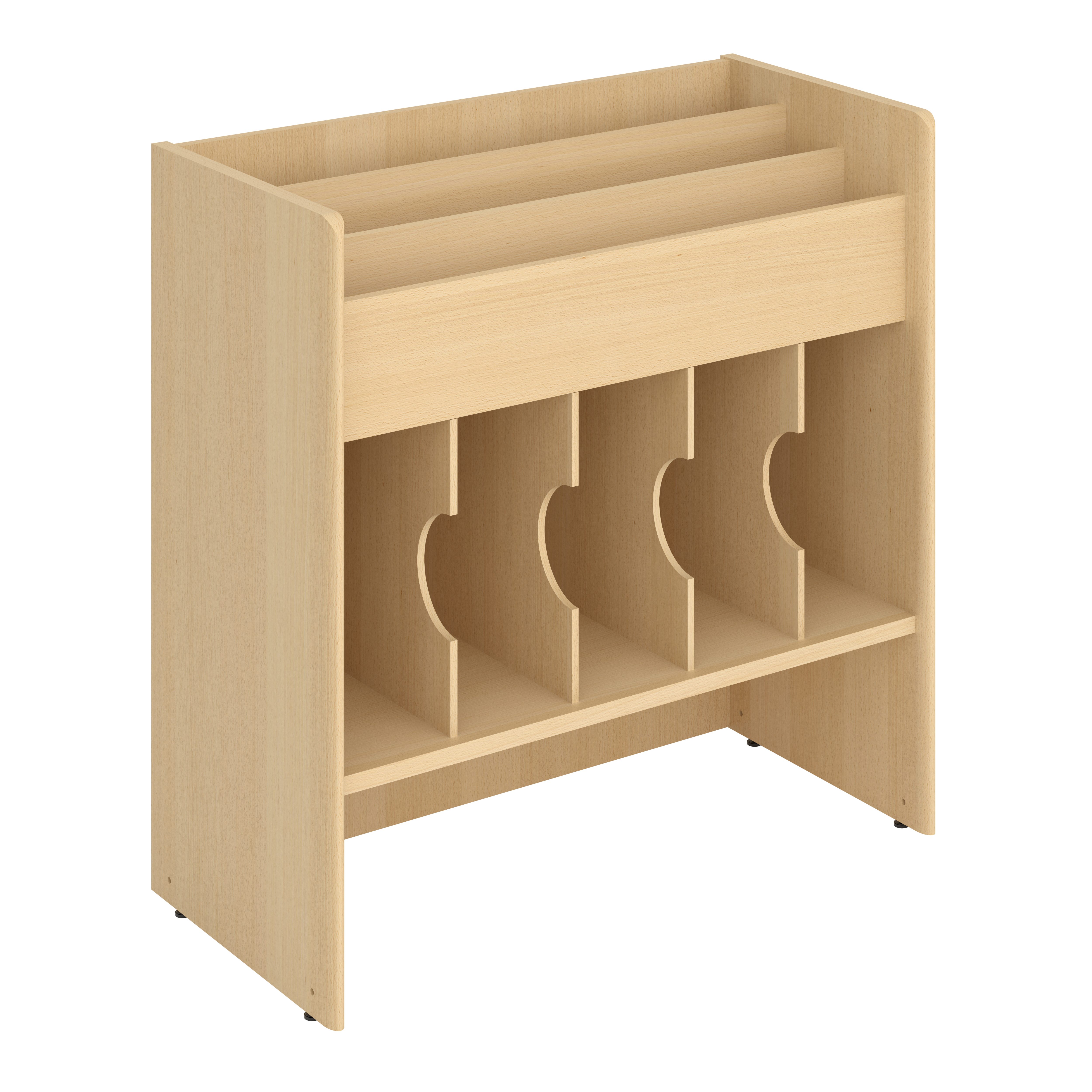 Bilderbuchtrog mit drei Präsentationsfächern oben und funf Aufbewahrungsfächern unten.