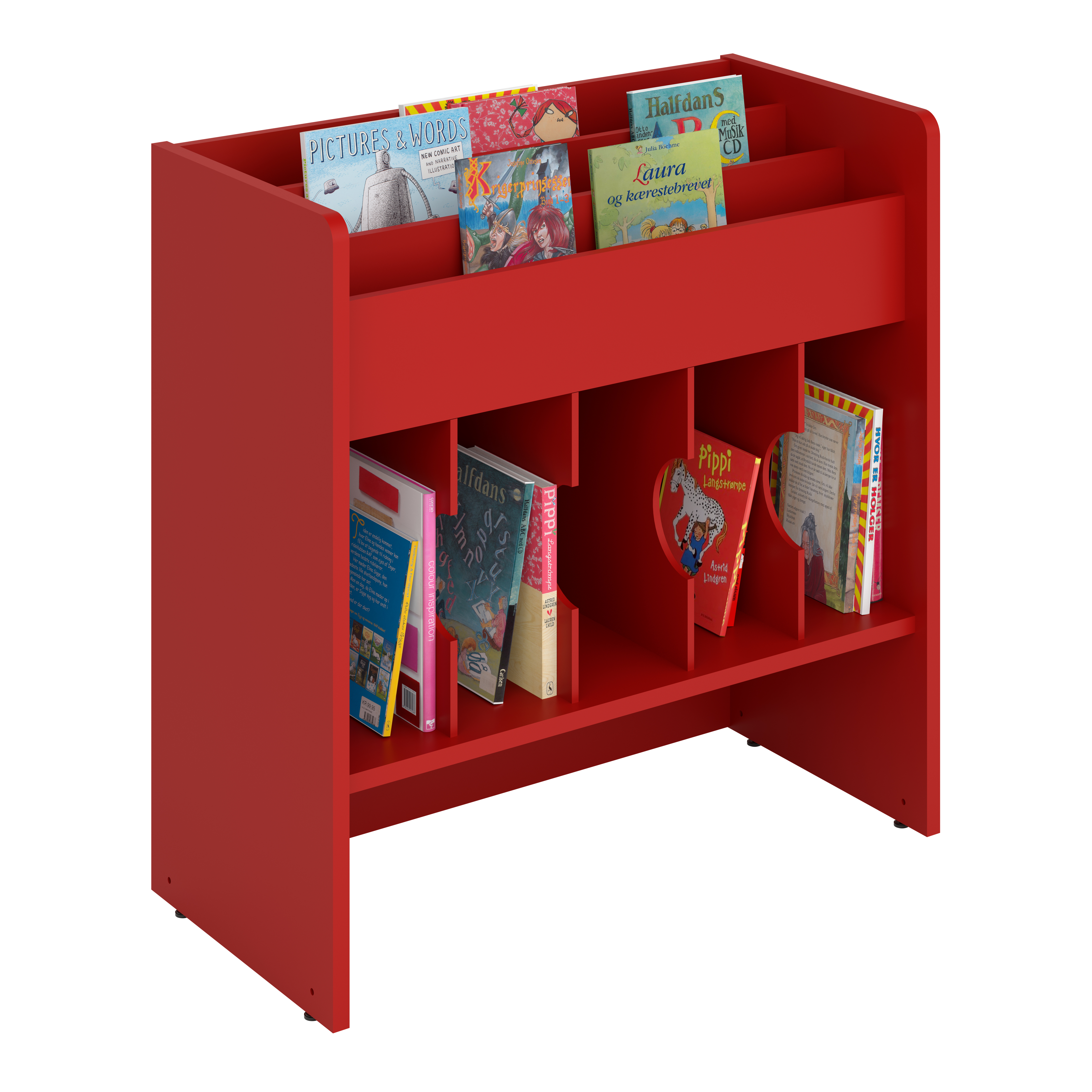 Bilderbuchtrog mit drei Präsentationsfächern oben und funf Aufbewahrungsfächern unten.