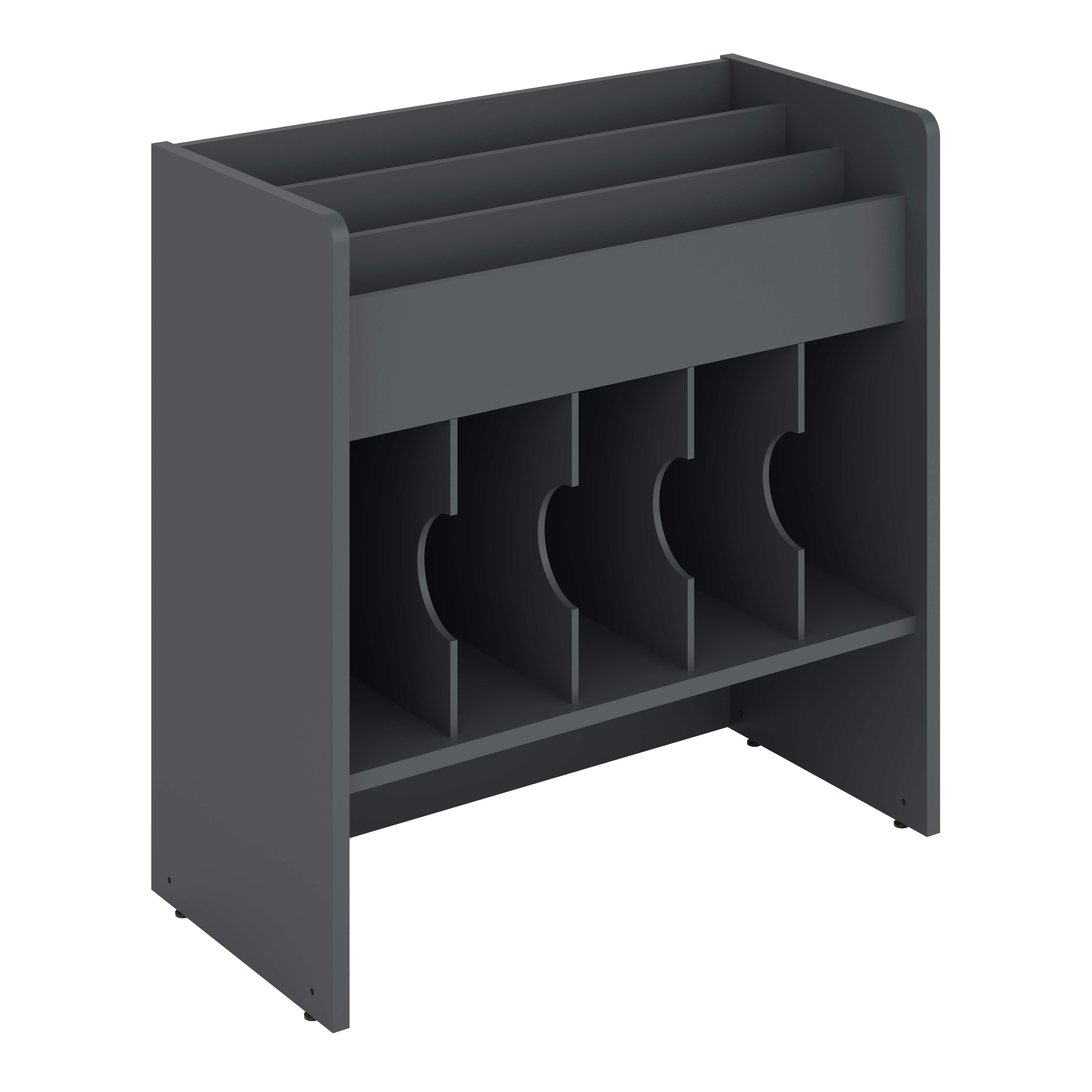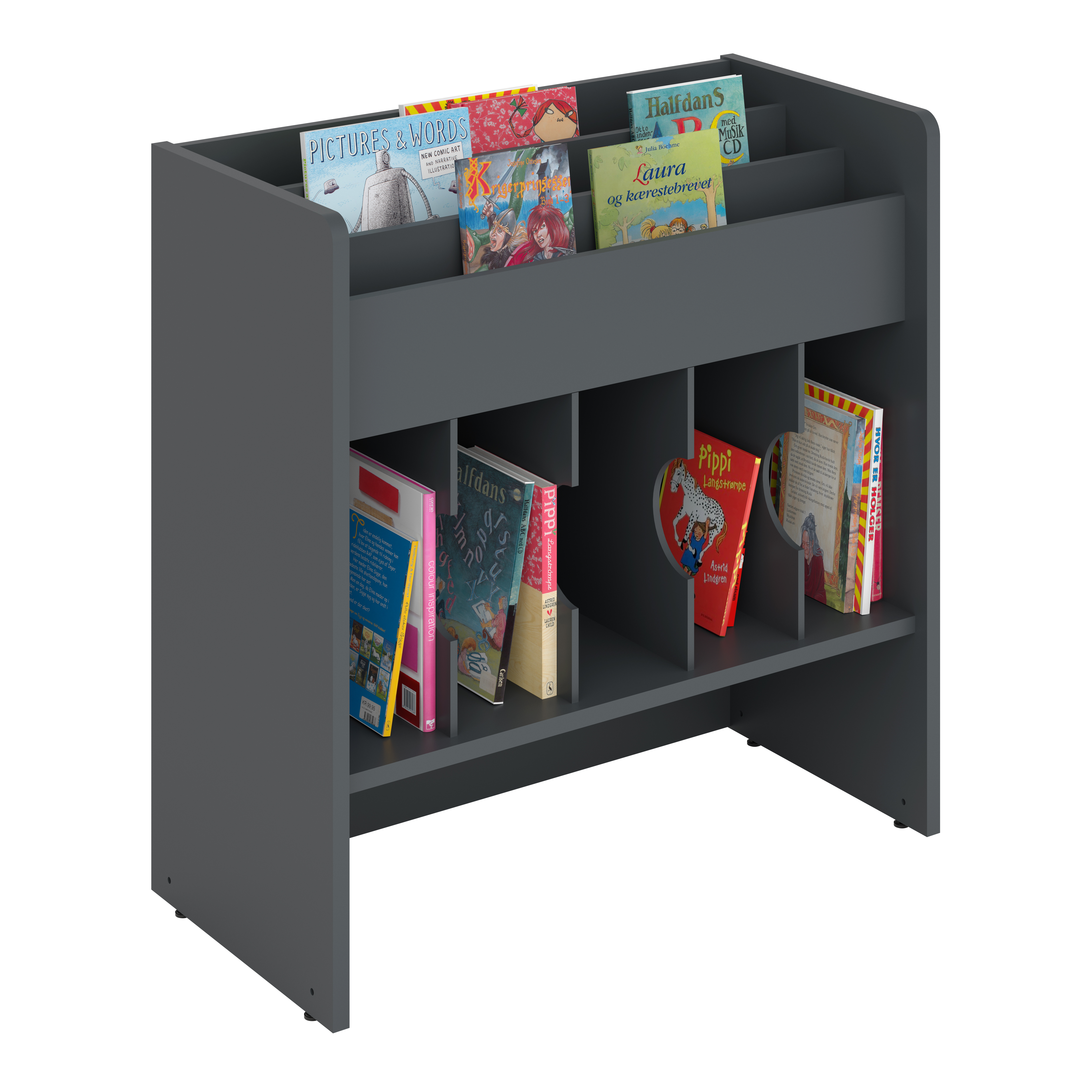 Bilderbuchtrog mit drei Präsentationsfächern oben und funf Aufbewahrungsfächern unten.