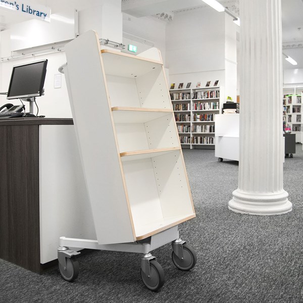Die Neigung des Bücherwagens sorgt für eine sichere Medienunterbringung und bietet eine gute Übersicht über die jeweiligen Bücher.