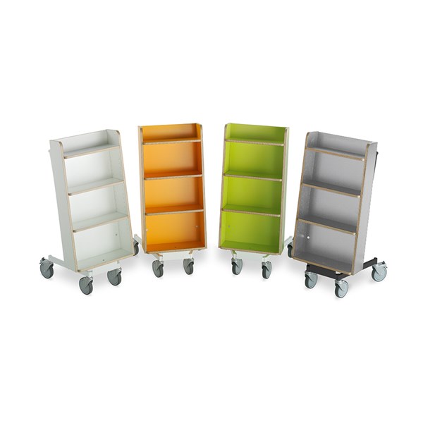 Benutzerfreundlicher, einseitiger Bücherwagen mit vier Fachböden. Die beiden mittleren Fachböden sind versetzbar und können an der Größe der Medien angepasst werden.
