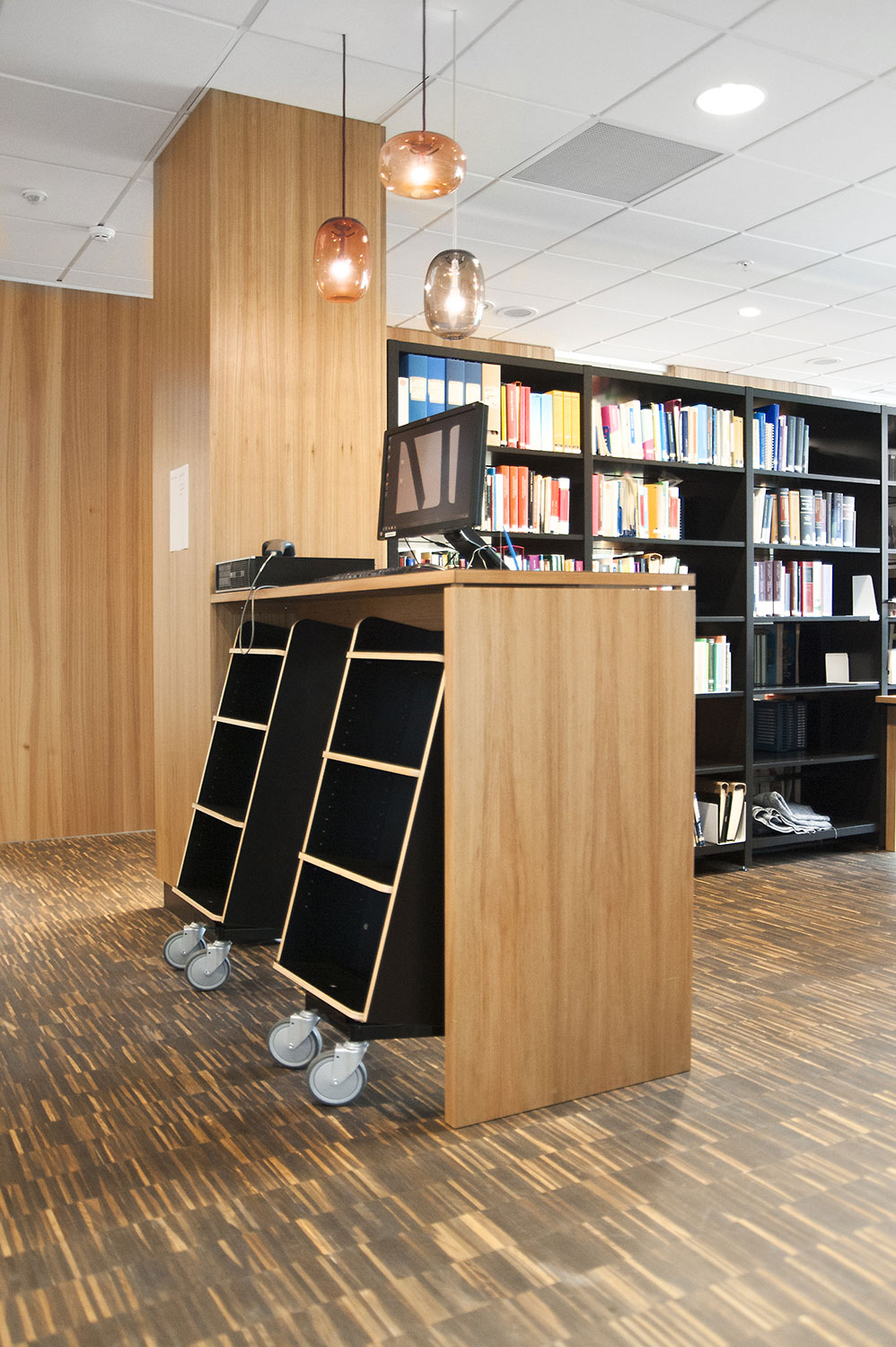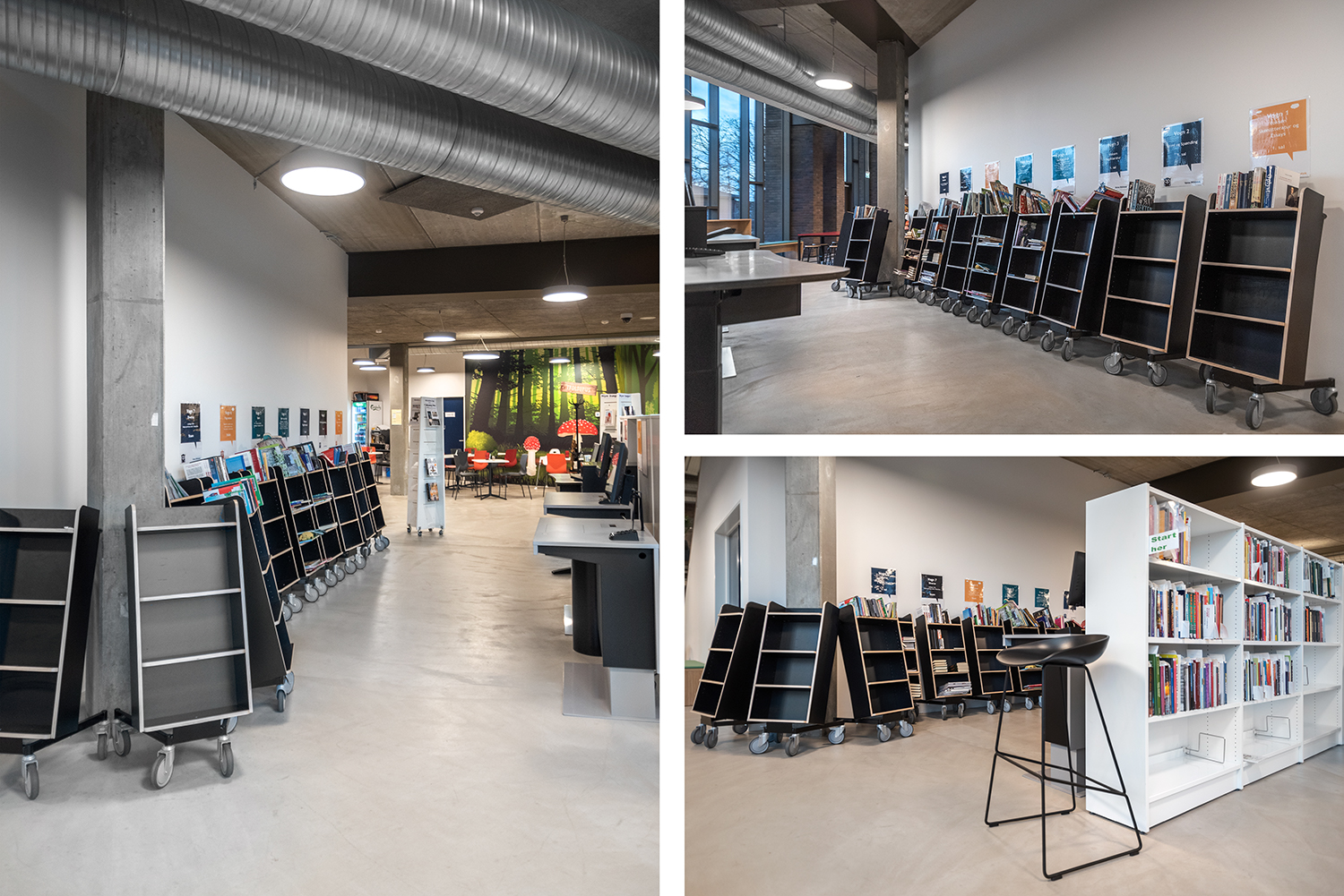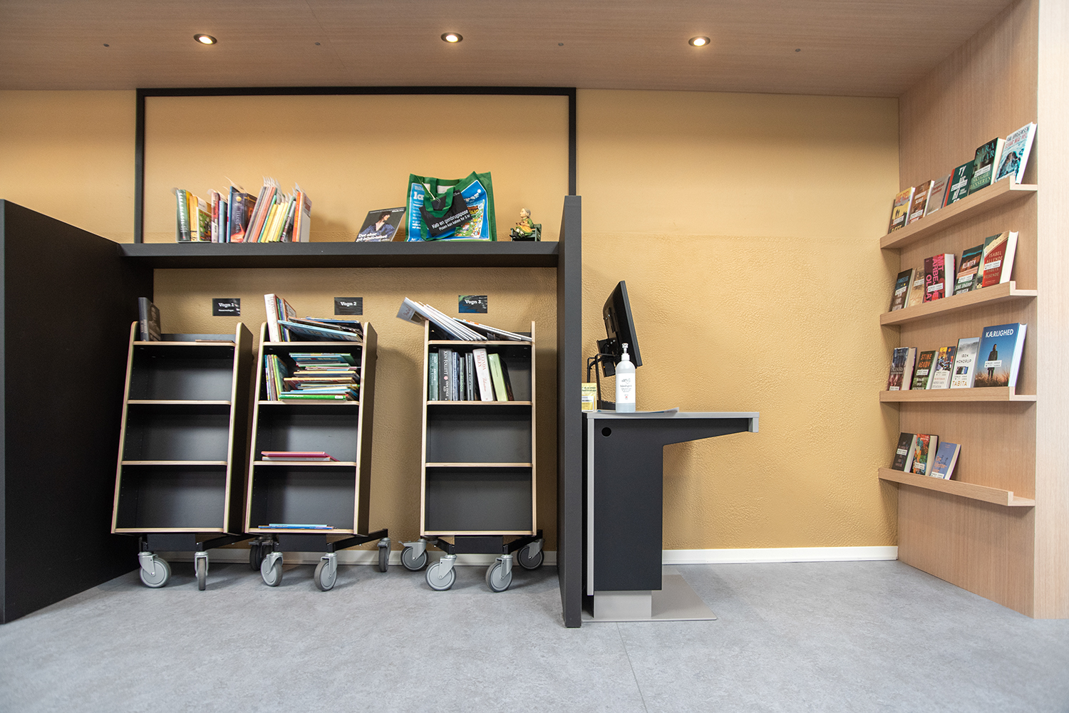 Die Neigung des Bücherwagens sorgt für eine sichere Medienunterbringung und bietet eine gute Übersicht über die jeweiligen Bücher.