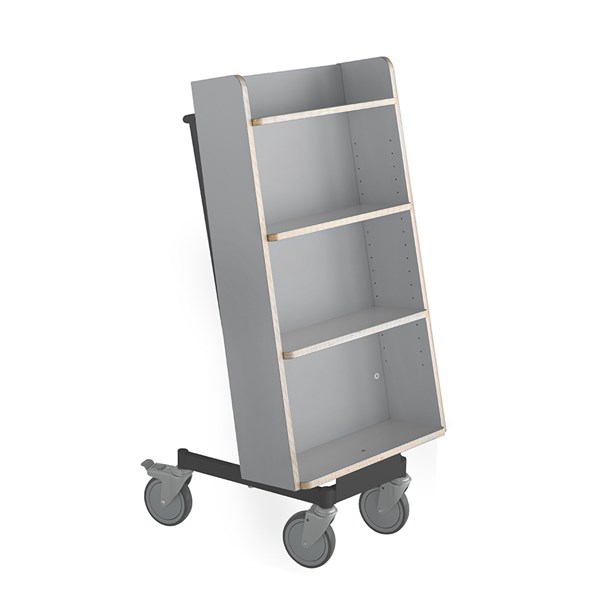 Die Neigung des Bücherwagens sorgt für eine sichere Medienunterbringung und bietet eine gute Übersicht über die jeweiligen Bücher.