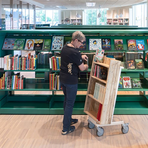Die Neigung des Bücherwagens sorgt für eine sichere Medienunterbringung und bietet eine gute Übersicht über die jeweiligen Bücher.