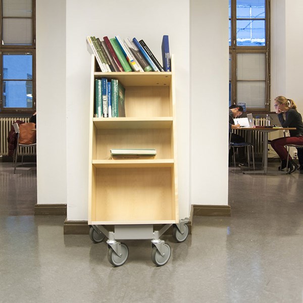 Die Neigung des Bücherwagens sorgt für eine sichere Medienunterbringung und bietet eine gute Übersicht über die jeweiligen Bücher.