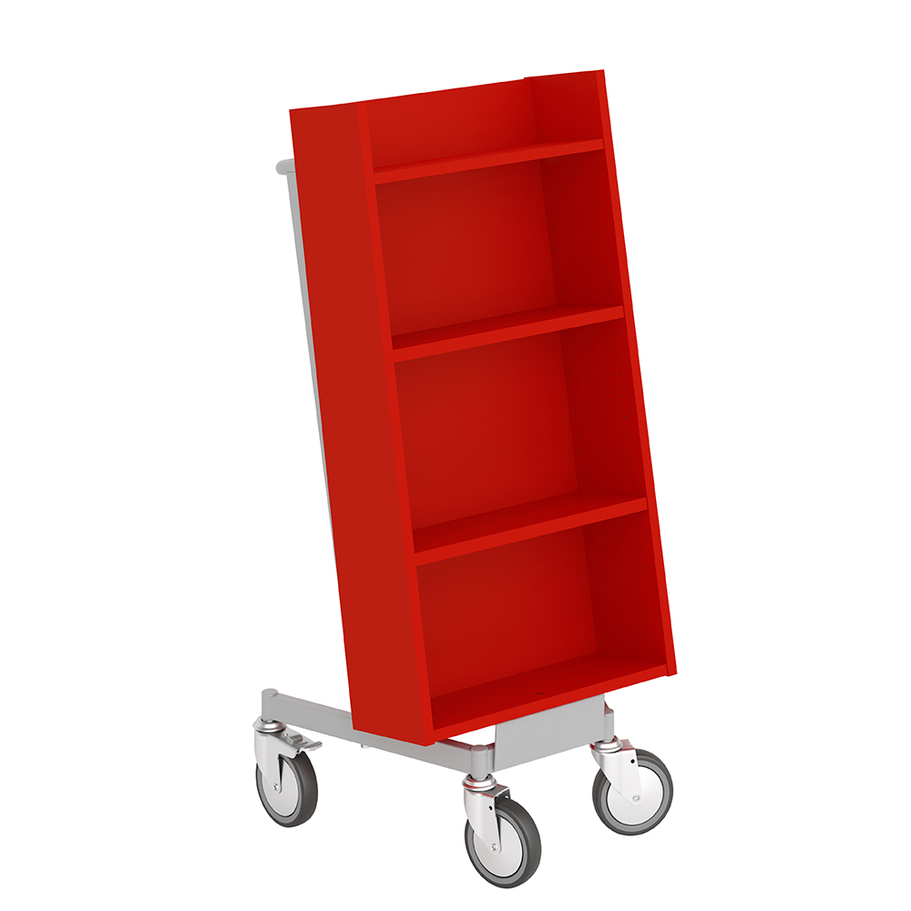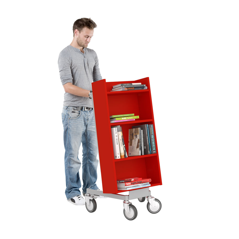 Die Neigung des Bücherwagens sorgt für eine sichere Medienunterbringung und bietet eine gute Übersicht über die jeweiligen Bücher.