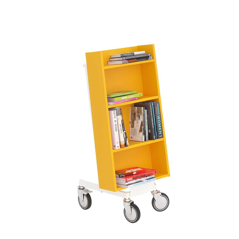 Die Neigung des Bücherwagens sorgt für eine sichere Medienunterbringung und bietet eine gute Übersicht über die jeweiligen Bücher.
