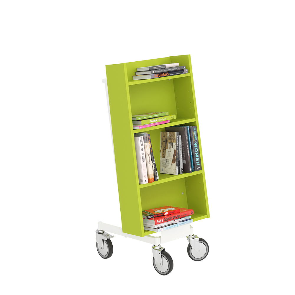 Benutzerfreundlicher, einseitiger Bücherwagen mit vier Fachböden. Die beiden mittleren Fachböden sind versetzbar und können an der Größe der Medien angepasst werden.