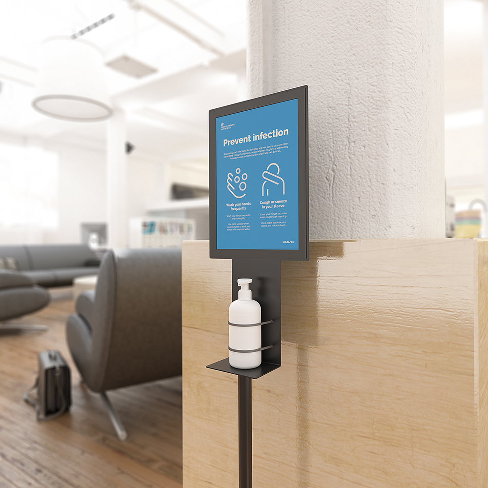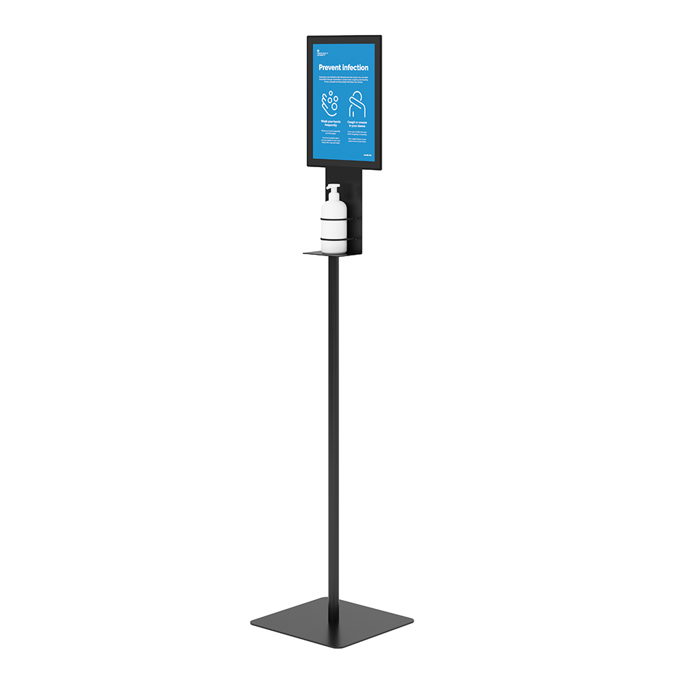 Freistehender stabiler Spender zur Handdesinfektion mit einem A4 Magnetrahmen, welcher mit entsprechender Information versehen werden kann.
