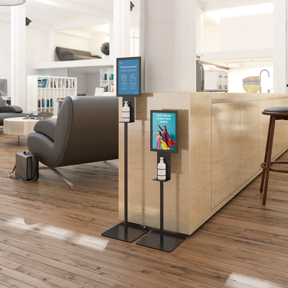 Platzieren Sie den Ständer im Eingangsbereich, Rückgabebereich, Infotheken und Opacs um eine optimale Hygiene in der ganzen Bibliothek sicherzustellen.