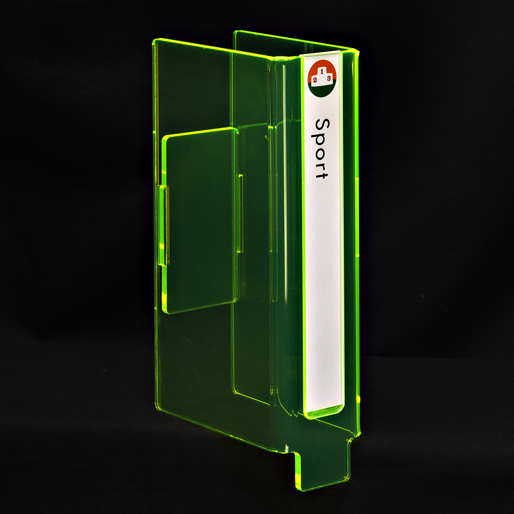 Regalkennungen aus hochwertiger Glasoptik oder fluoreszierendes Neonacryl hergestellt.