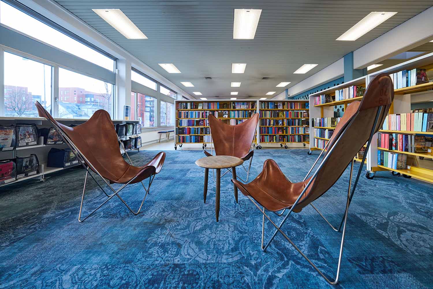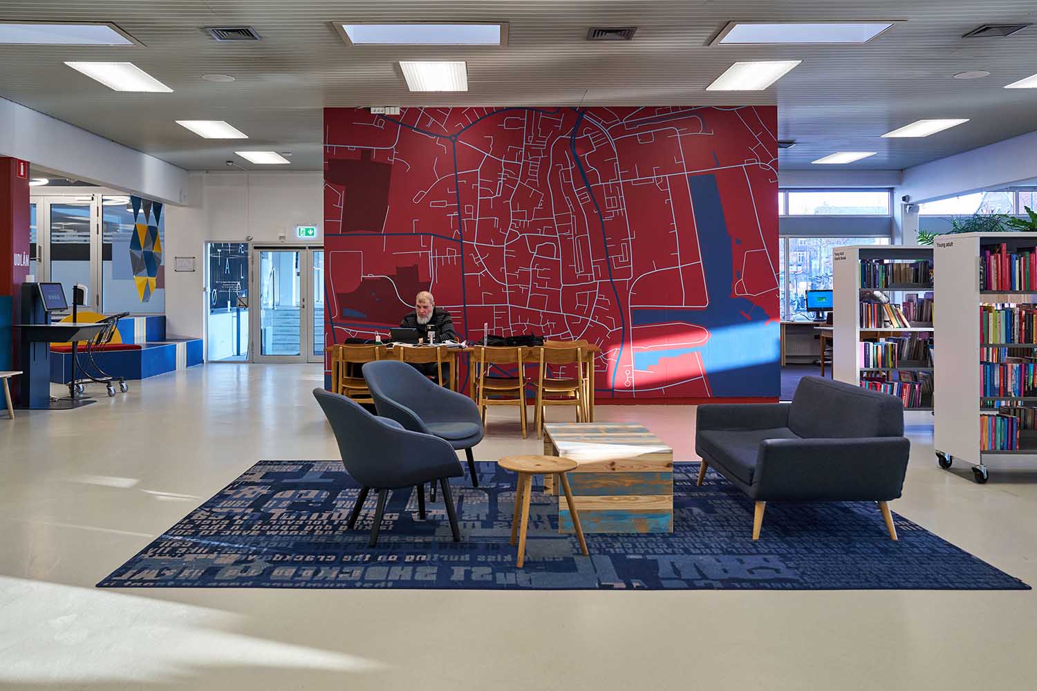 Um dem gesamten Gebäude neues Leben einzuhauchen, wurden in der gesamten Bibliothek schöne Wandfarben, Folienlösungen und Teppiche verwendet. Die farbenfrohen Teppiche mit sorgfältig ausgewählten Mustern tragen dazu bei, eine lebendige und inspirierende Atmosphäre zu schaffen. Sie vermitteln ein „heimeliges“ Gefühl von Gemütlichkeit und öffnen die Räume, sodass sie einladend wirken. Darüber hinaus rahmen schöne neue Grafiken, Sitzgelegenheiten in verschiedenen Formen und Farben, akustische Lösungen und eine spezielle Beleuchtung die Räume auf lebendige Weise ein.