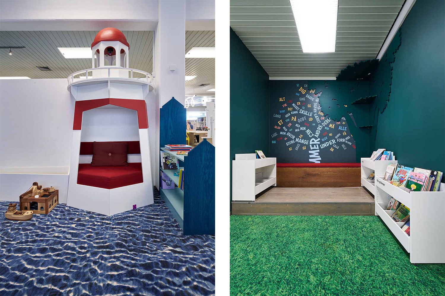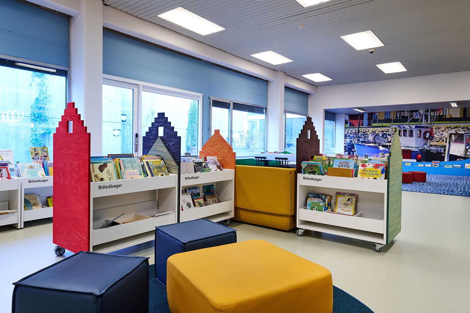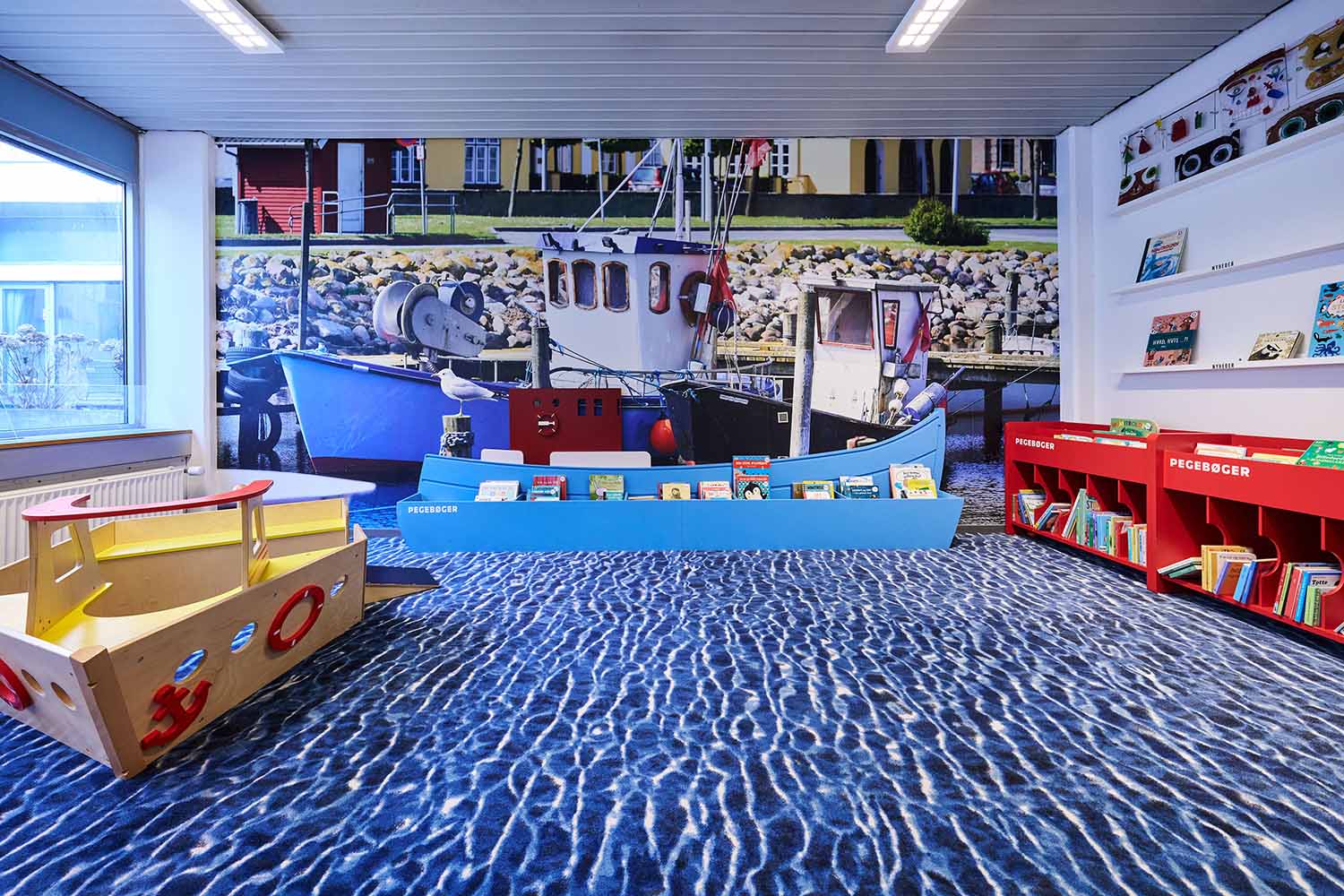 Am Eingang zum Kinderbereich hat die blaue Treppe eine bunte Auffrischung erhalten, inspiriert von den Farben und Formen der lokalen Künstlerin Franziska Clausen - eine klare lokale Verankerung und ein visueller Ansatz, der signalisiert, dass man eine besondere Welt betritt. Im „Meeresbereich“ ist ein schöner neuer Leuchtturm eingezogen, dessen Licht sich dreht und Fäden zum Industriehafen von Aabenraa zieht, der Kinder und Erwachsene gleichermaßen zum Spielen und gemütlichen Verweilen einlädt. Darüber hinaus gibt es einen Lesebaum und einen kleinen „Lesewald“, der zur Ruhe, zum Verweilen und zum Vorlesen einlädt.