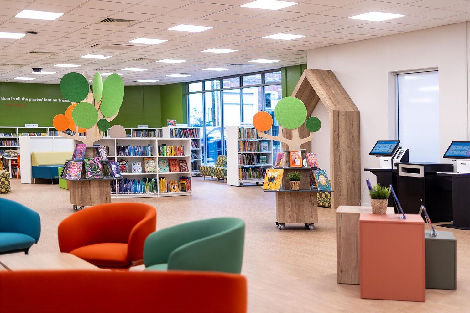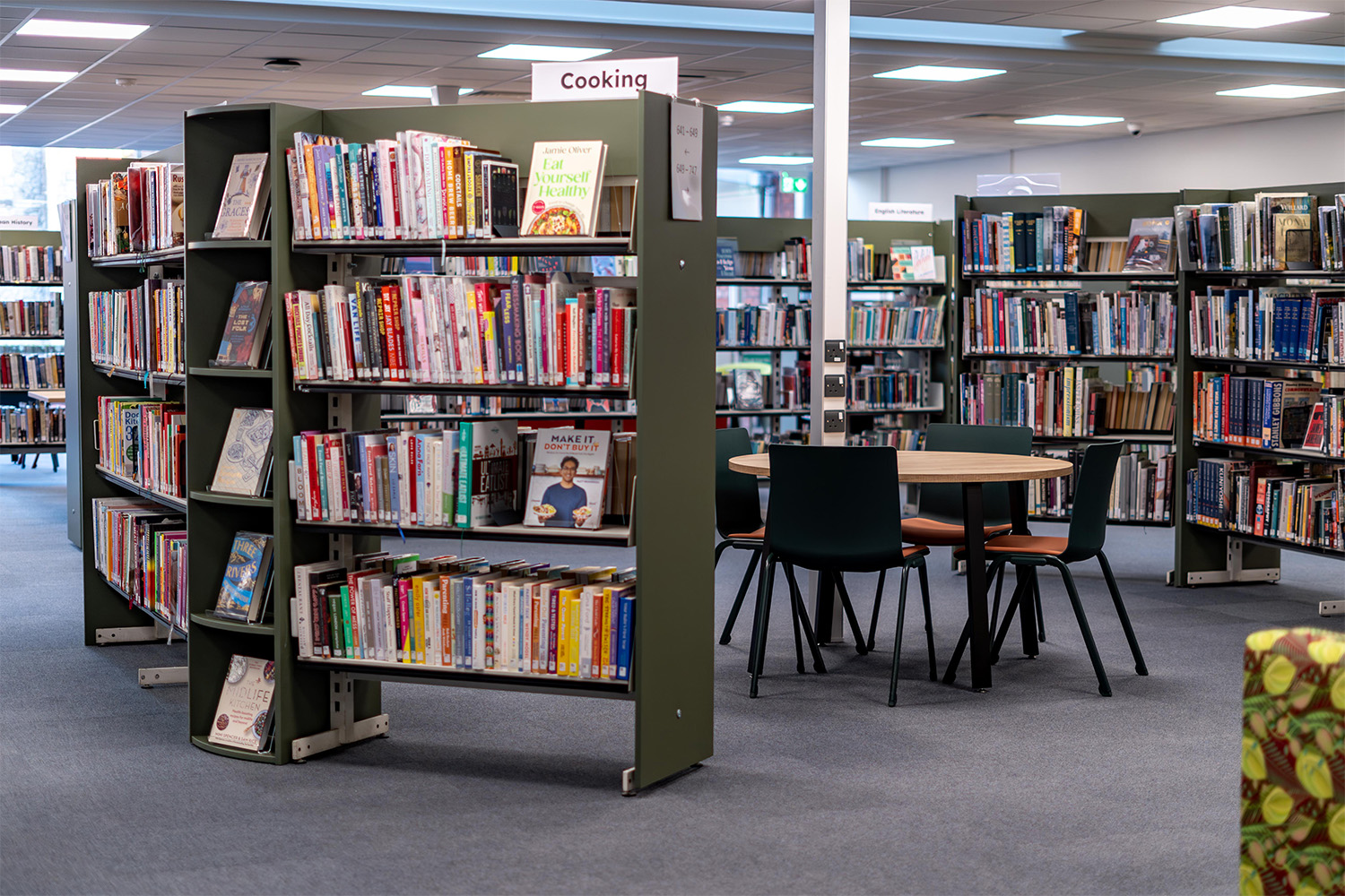 Da der Essex County Council bei seinen Renovierungen auf umweltfreundliche öffentliche Räume Wert legt, arbeiteten wir eng mit ihm zusammen, um den vorhandenen Regalen ein neues Leben einzuhauchen. Indem wir die vorhandenen Regale mit einer neuen Verkleidung versehen haben, haben wir eine deutliche optische Aufwertung erreicht - unter Berücksichtigung von Ressourcen und Nachhaltigkeit.