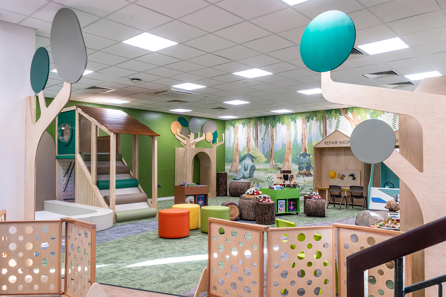 Vom Klettern durch das Baumhaus und dem Blick aus den Fenstern bis hin zum Einsteigen in den speziell entworfenen Tierambulanzwagen oder dem Einsatz der eigenen Hände in der Reparaturwerkstatt - das vom Wald inspirierte Universum bietet für jeden etwas. Ob man nun die Strukturen erkundet oder sich in den weichen Möbeln entspannt, Unterhaltung und Lernen kommen ganz natürlich zusammen.