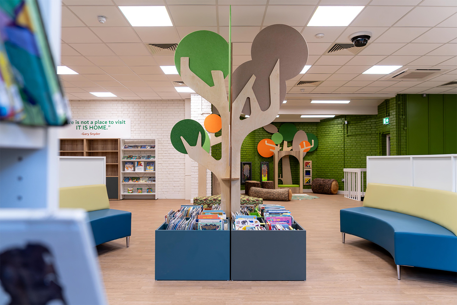 Die Besucher können sich im Studienbereich für Kinder unter Zitaten von inspirierenden kreativen Denkern wie Walt Disney niederlassen oder ein Buch in speziell entworfenen Sesseln genießen, umgeben von Worten von R. David Lankes. Zusammen vervollständigen diese Details eine Bibliothek, die alle inspirieren, ansprechen und willkommen heißen soll.