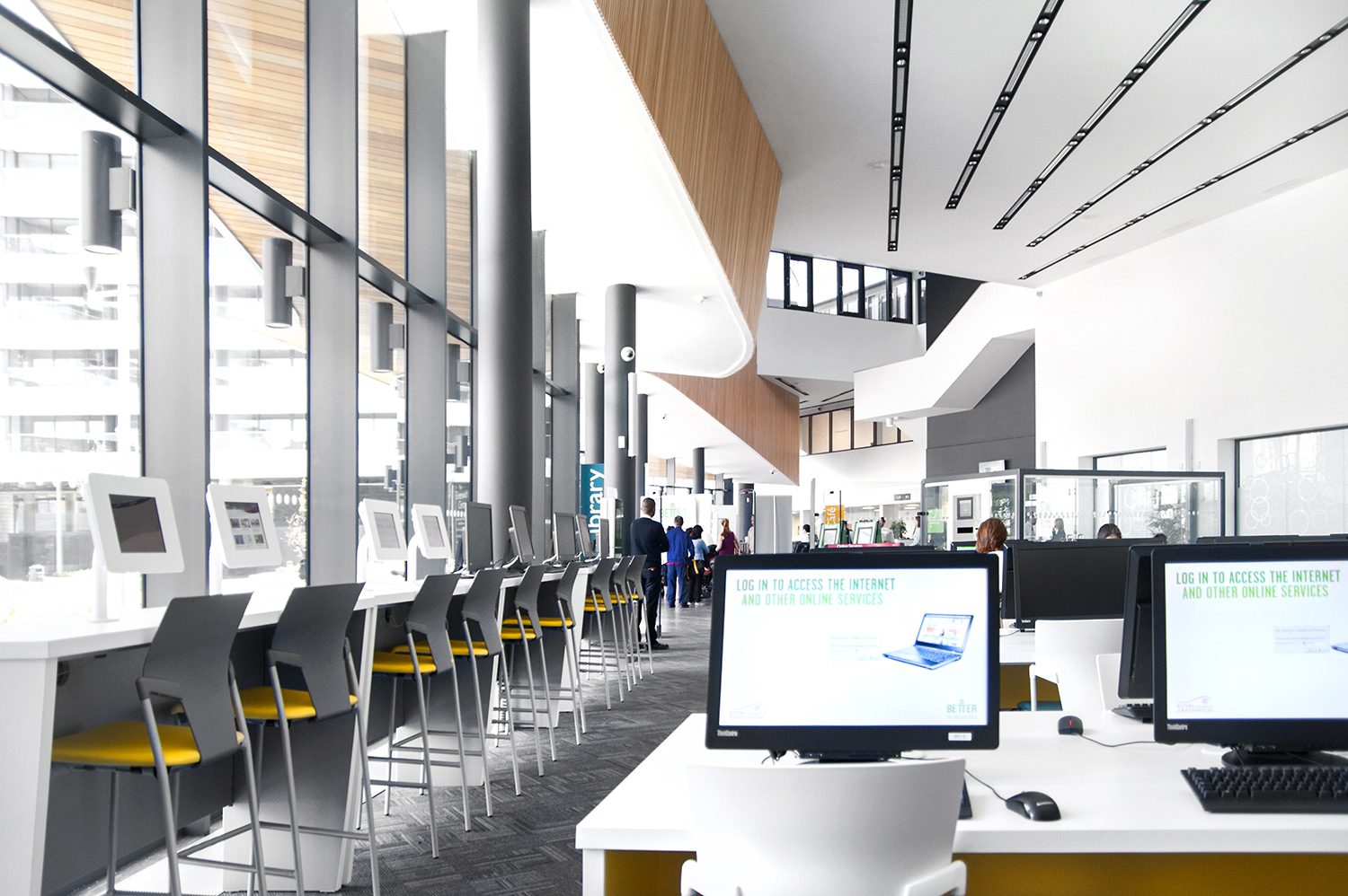 Thedesignconcept ltd. führte anregende und inspirierende Möbel, Gadget-Bars und digitale Technologie in diesen aufregenden Bibliotheksraum ein. Eine Reihe von PCs steht der Öffentlichkeit zur Verfügung, um auf das Internet zuzugreifen, eine Gadget-Bar bietet Lademöglichkeiten für Telefone und Laptops im "ruhigen" Lernbereich in der Bibliothek.