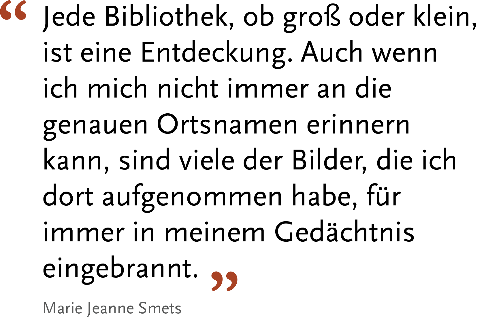Unter den vielen Höhepunkten nennt Marie Jeanne DOKK1 in Aarhus, die Permeke-Bibliothek in Antwerpen, die Bibliothek von Angoulême, die Universitätsbibliotheken in Caen, Luxemburg und Darmstadt sowie die großartige Bibliothek in Dubai. Aber auch viele andere haben einen bleibenden Eindruck hinterlassen – von Lappland im Norden über Berlin, London und Paris bis hinunter nach Marseille und überall dazwischen.