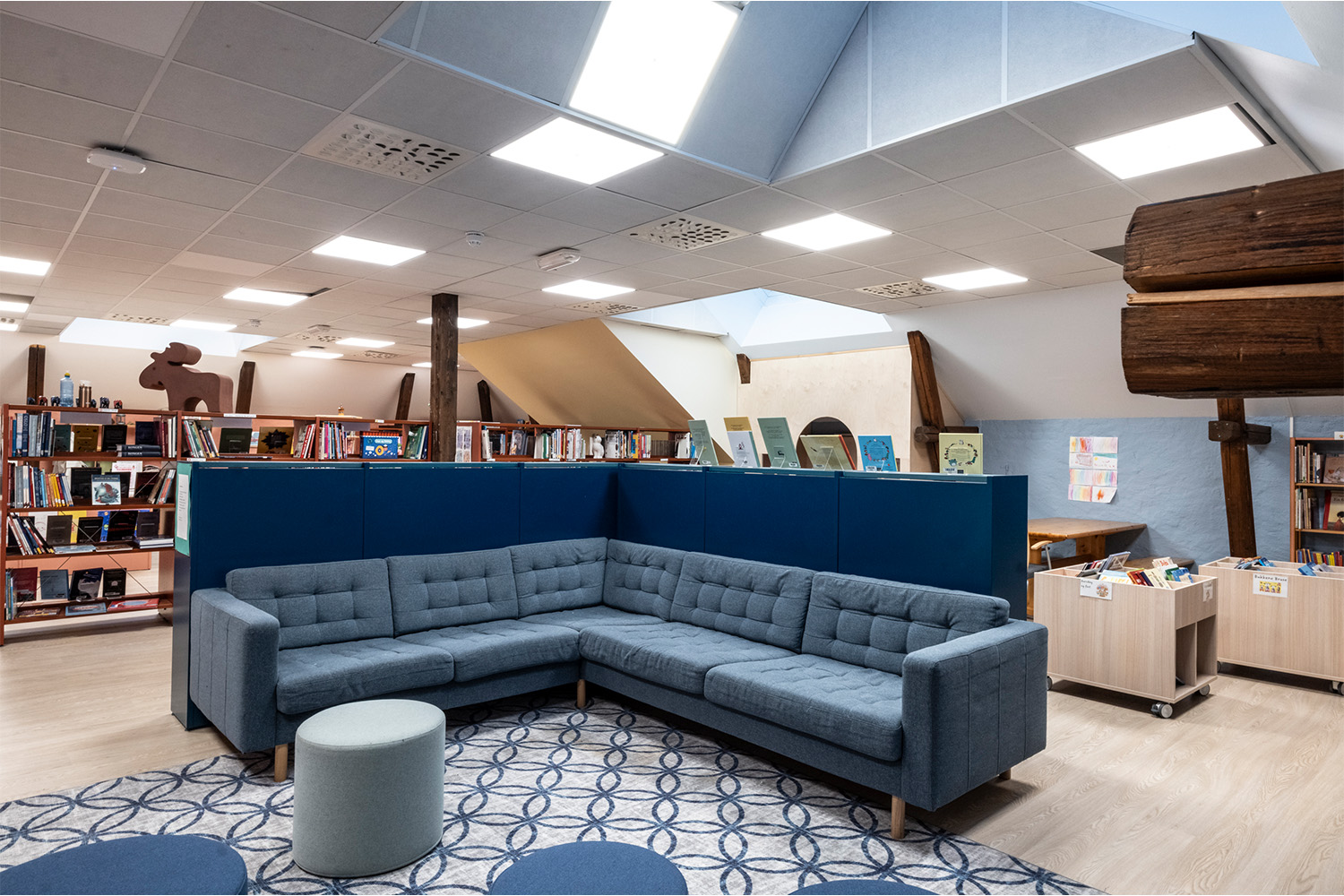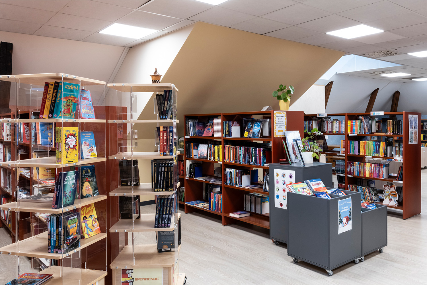 Die Bibliothek befindet sich im vierten Stock und verfügt über schräge Decken und freiliegende Holzbalken. Die warmen Farben der Wände und Regale schaffen eine einladende und gemütliche Atmosphäre.