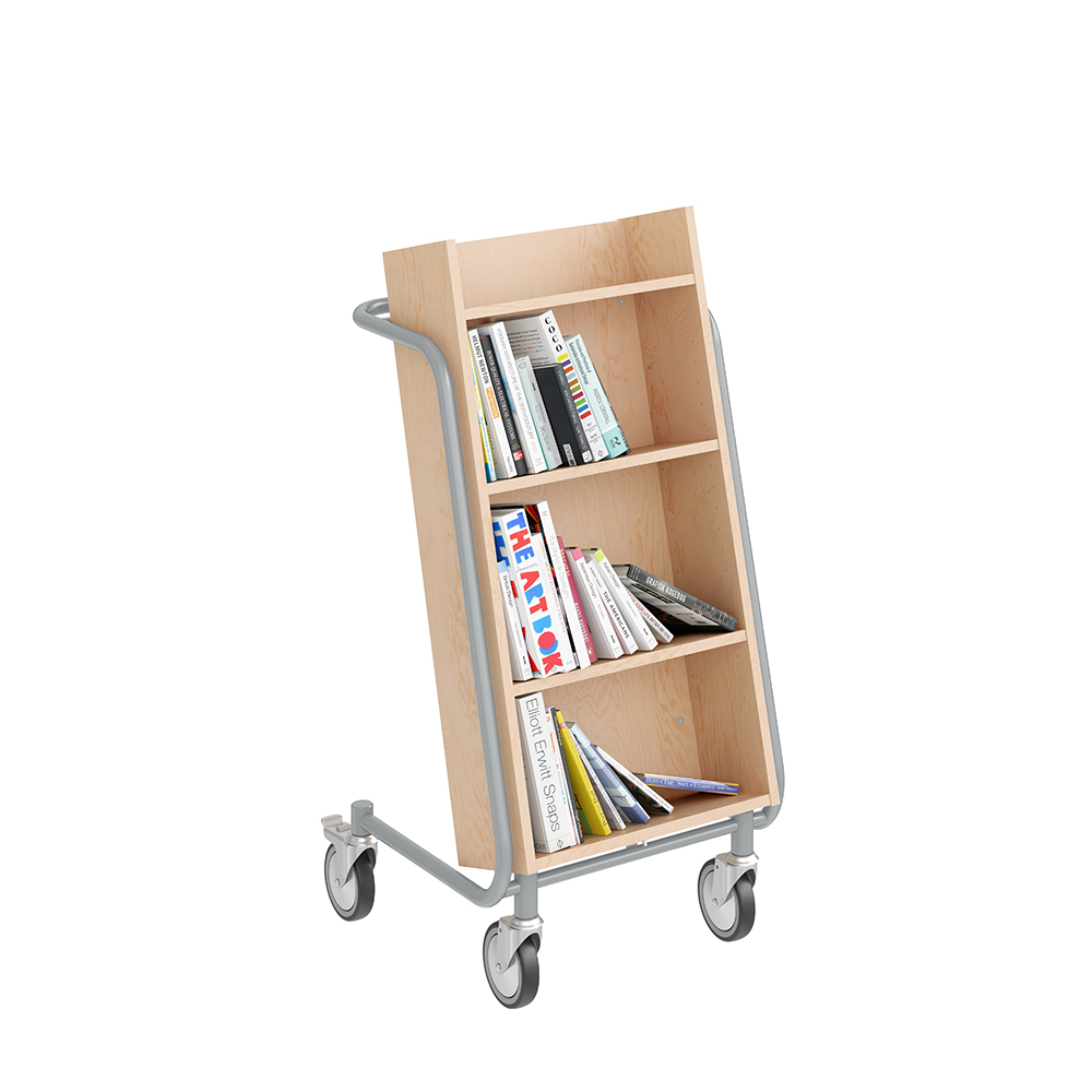 Die Neigung des Bücherwagens sorgt für eine sichere Medienunterbringung und bietet eine gute Übersicht über die jeweiligen Bücher.