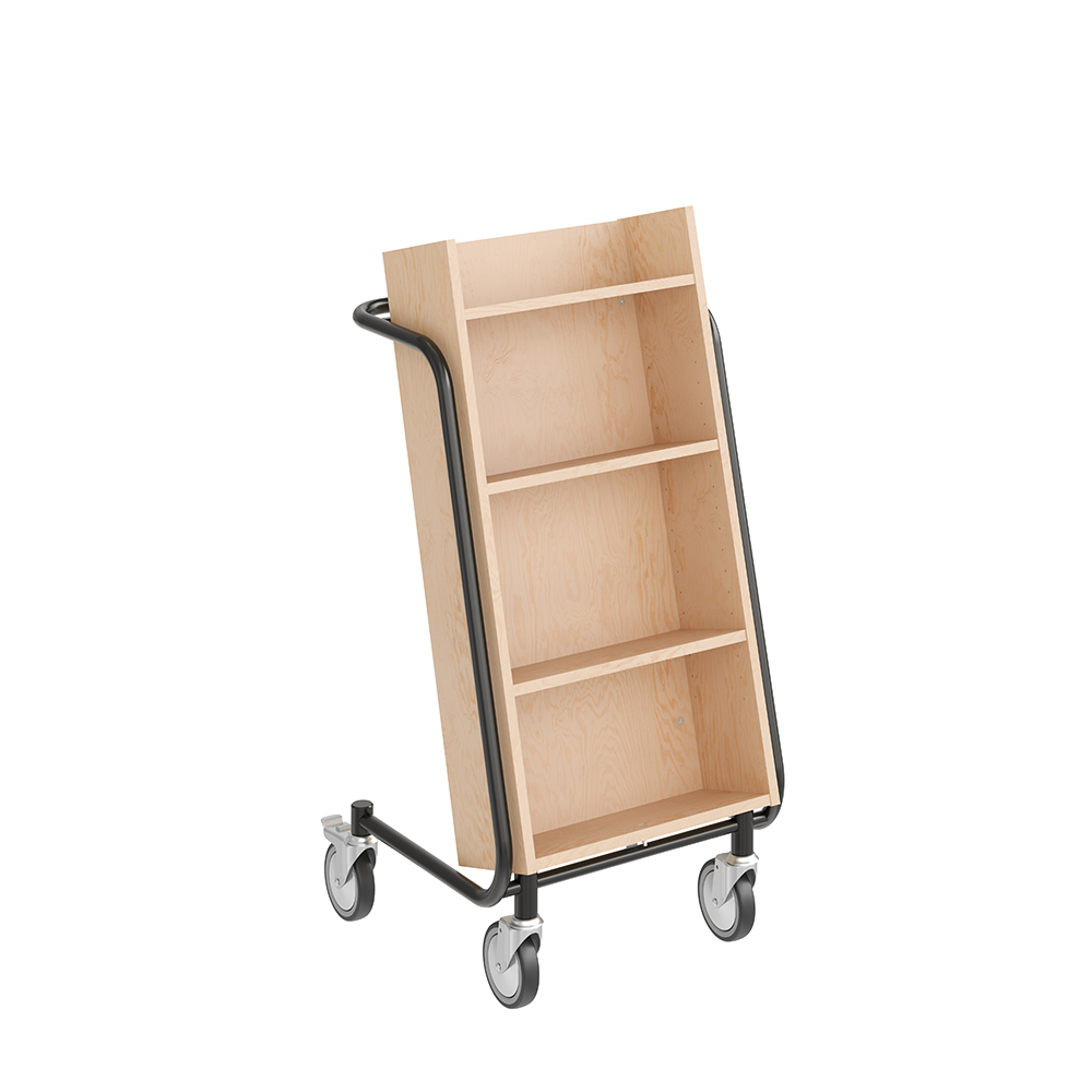 Benutzerfreundlicher, einseitiger Bücherwagen mit vier Fachböden. Die beiden mittleren Fachböden sind versetzbar und können an der Größe der Medien angepasst werden.