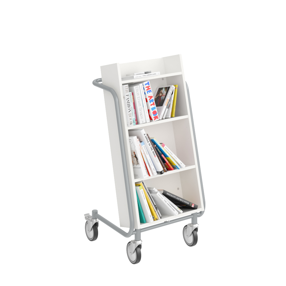 Die Neigung des Bücherwagens sorgt für eine sichere Medienunterbringung und bietet eine gute Übersicht über die jeweiligen Bücher.