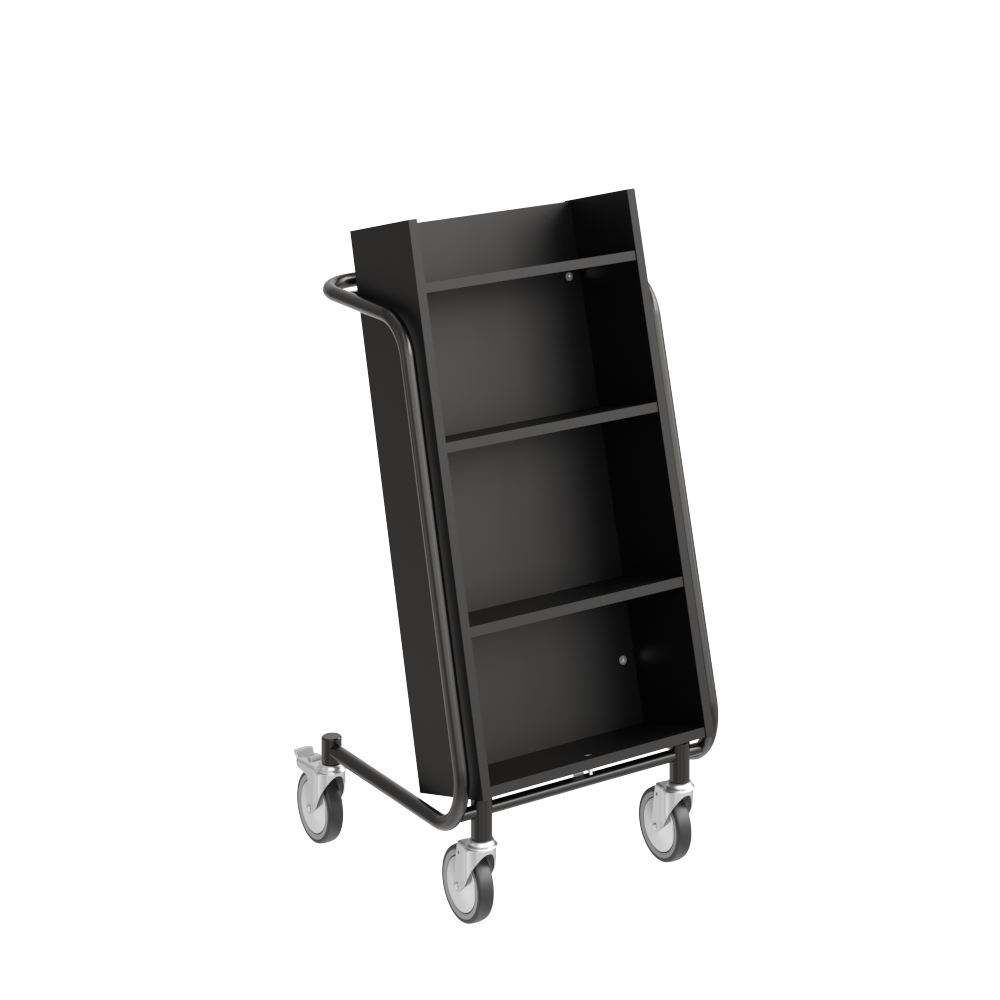 Benutzerfreundlicher, einseitiger Bücherwagen mit vier Fachböden. Die beiden mittleren Fachböden sind versetzbar und können an der Größe der Medien angepasst werden.