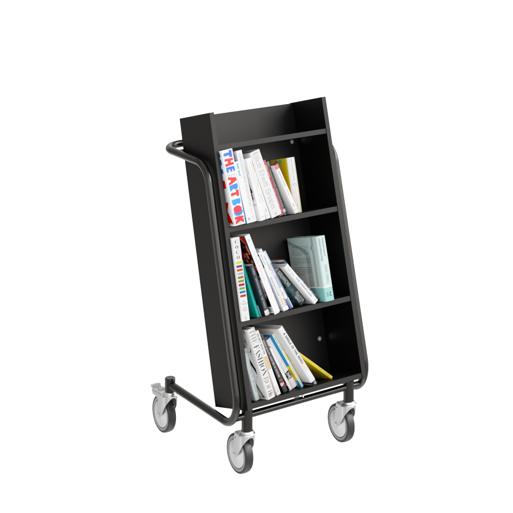 Die Neigung des Bücherwagens sorgt für eine sichere Medienunterbringung und bietet eine gute Übersicht über die jeweiligen Bücher.