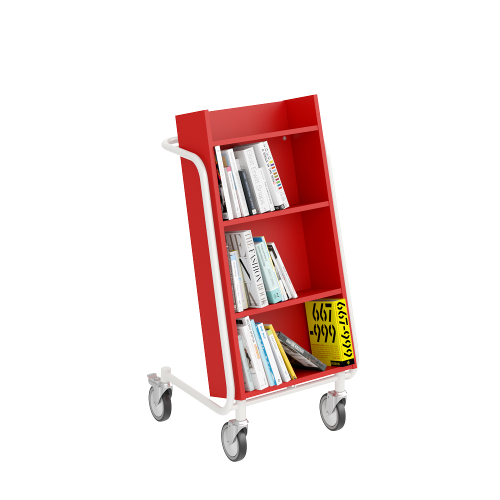 Die Neigung des Bücherwagens sorgt für eine sichere Medienunterbringung und bietet eine gute Übersicht über die jeweiligen Bücher.