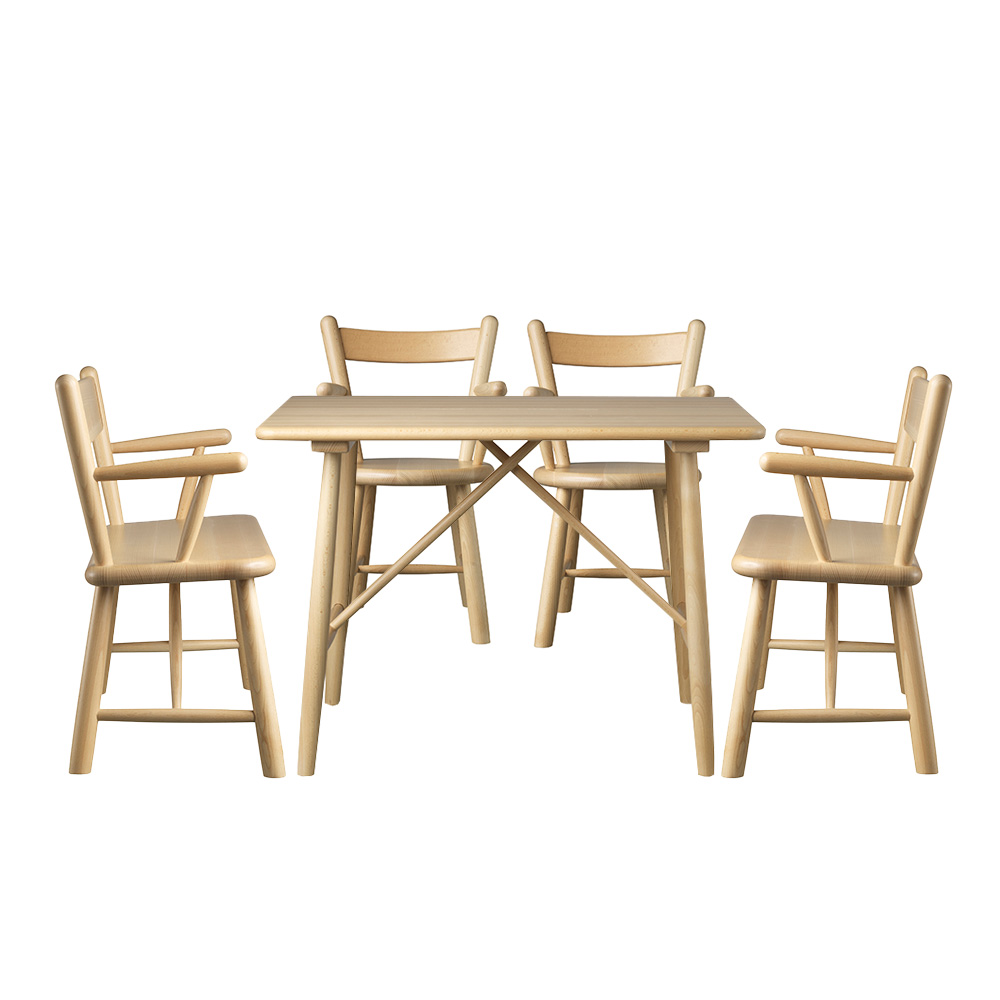 Die Möbel sind aus lackierter Buche gefertigt und erfordern nur minimale Pflege. Sie lassen sich mit einem feuchten Tuch abwischen.